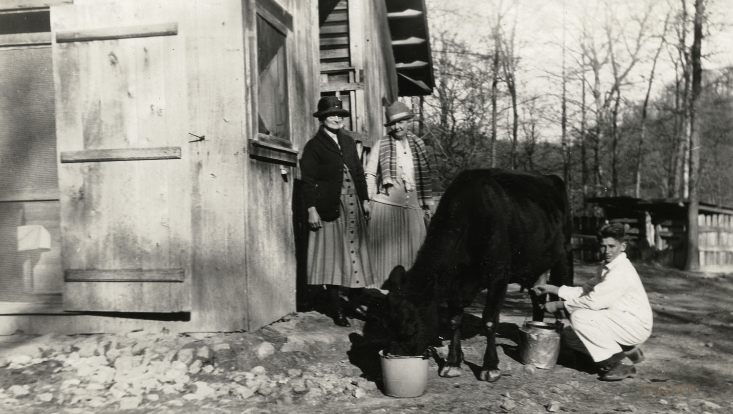 - Mrs. Burns, the dairy farmer and Miss Pettit? and student milking cow. norton_062.jpg