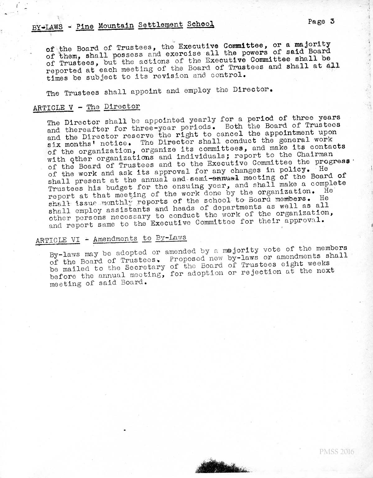 The Bylaws of Pine Mountain Settlement School have undergone many revisions, the most recently in 2015. Bylaws, according to Merriam-Webster, are those rules adopted by an organization chiefly for the government of its members and for the regulation of its affairs.
