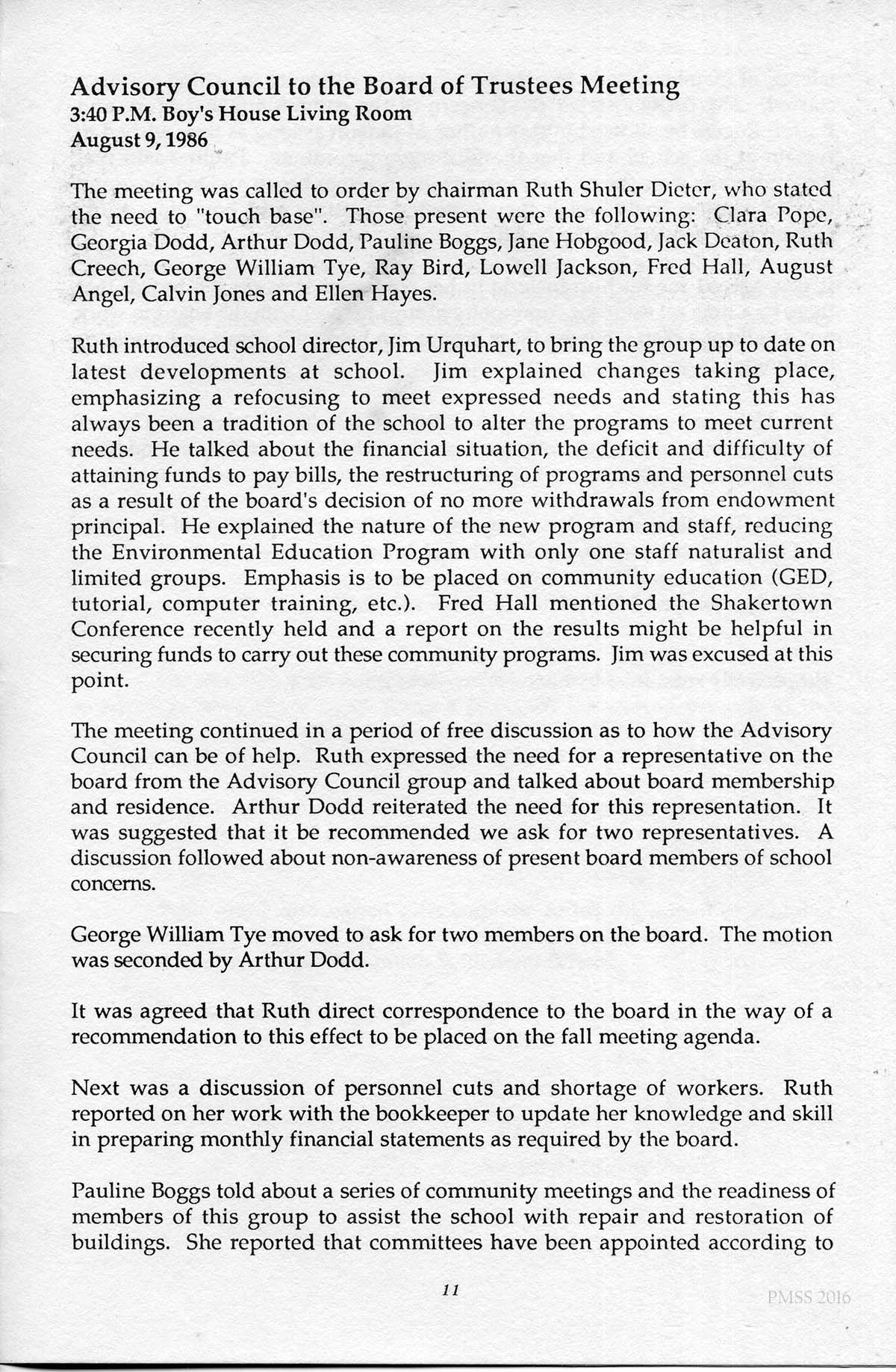 …talents, of members ready to help and about the difficulty in getting a project started. She further stated the concern of the community that Mary and Burton Rogers be allowed to stay at Pine Mountain as long as they wished to remain at the school and that the EE Program continue. Pauline said that these concerns were the primary reasons the meetings began and led the group to start setting goals which they expected to attain and how they could present their requests to the board.