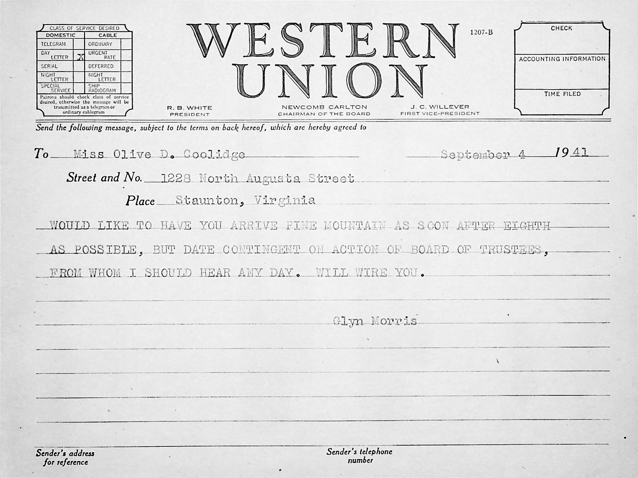 [Also, Olive to Glyn Morris: 9. draft telegram to Pine Mtn. Pine Mtn 9-7-41 and Morris to Olive, stating that she should come on “unofficial appointment”: 8. Telegram from Pine Mtn 9-7-41