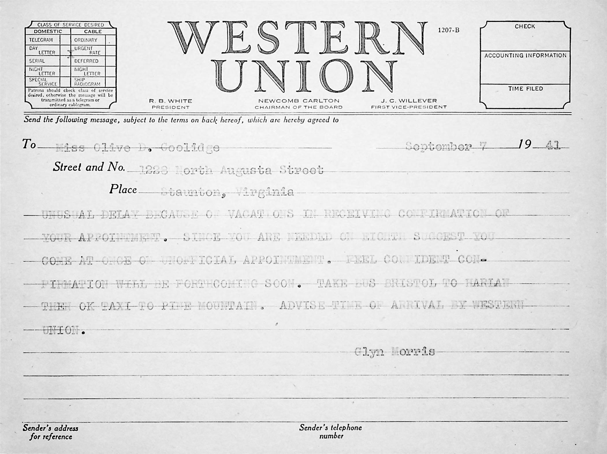 - 8. Telegram to Olive Coolidge from Glyn Morris 9-7-1941. [8.-Telegram-from-Pine-Mtn-9-7-41.jpg]
