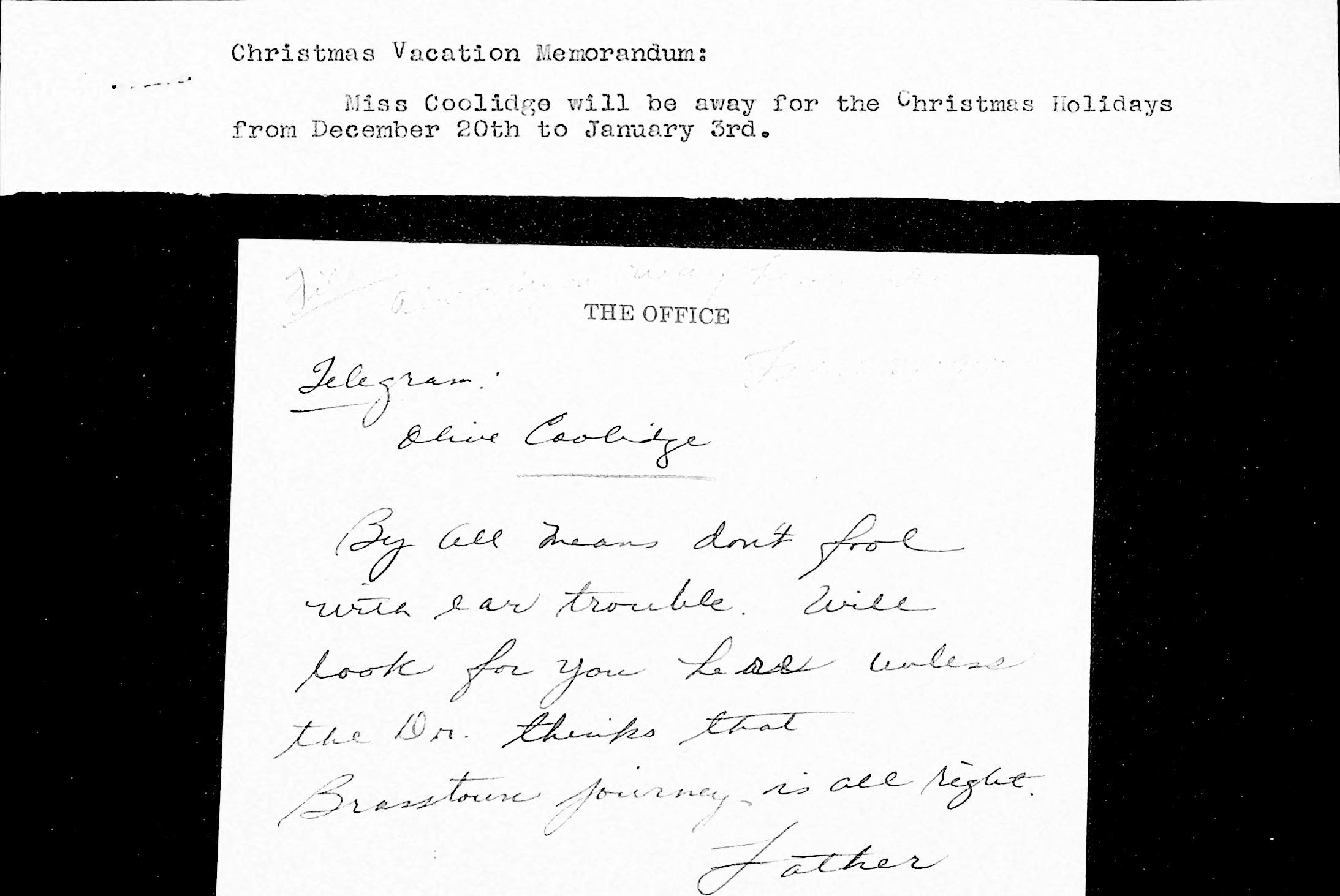 186 [image00186.jpg] Two documents: (1) Christmas Vacation Memorandum, stating dates that Coolidge will be away. (2) A handwritten note from THE OFFICE: “Telegram: Olive Coolidge. By all means don’t fool with ear trouble. Will look for you here unless the Dr. thinks that Brasstown journey is all right. Father.” [Richard Coolidge, Olive’s father.]