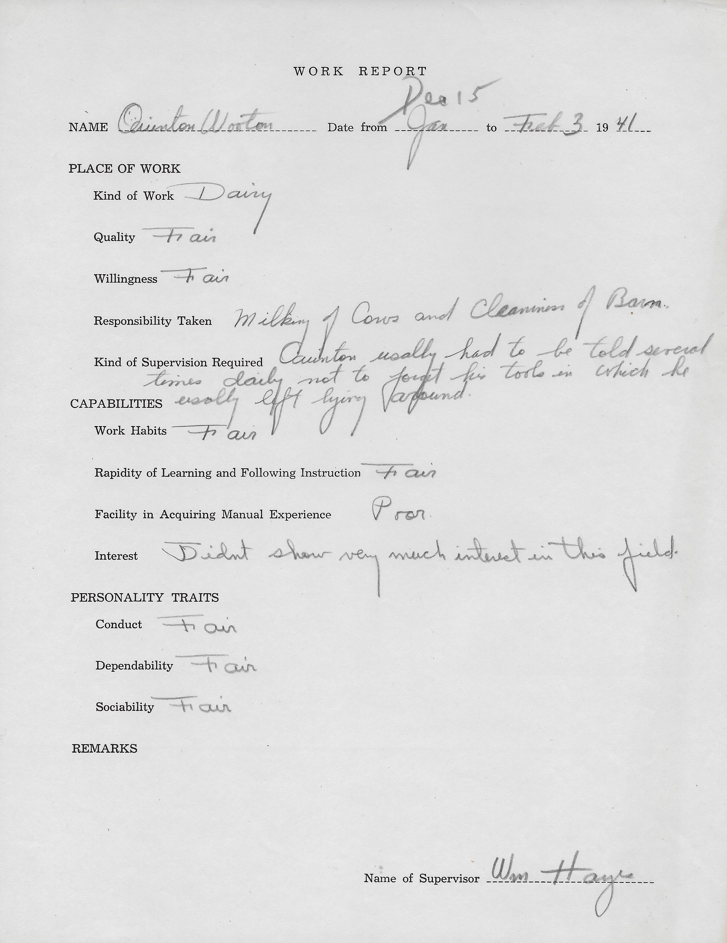 SCAN0299. Work Report for Quinten Wooton for April to May 1941 – Supervisor: William Hayes, Dairy House (cleaning of milk utensils). “Quinten improved considerably….” Work Habits: “Good worker…Seemed to enjoy his work much more this semester.”