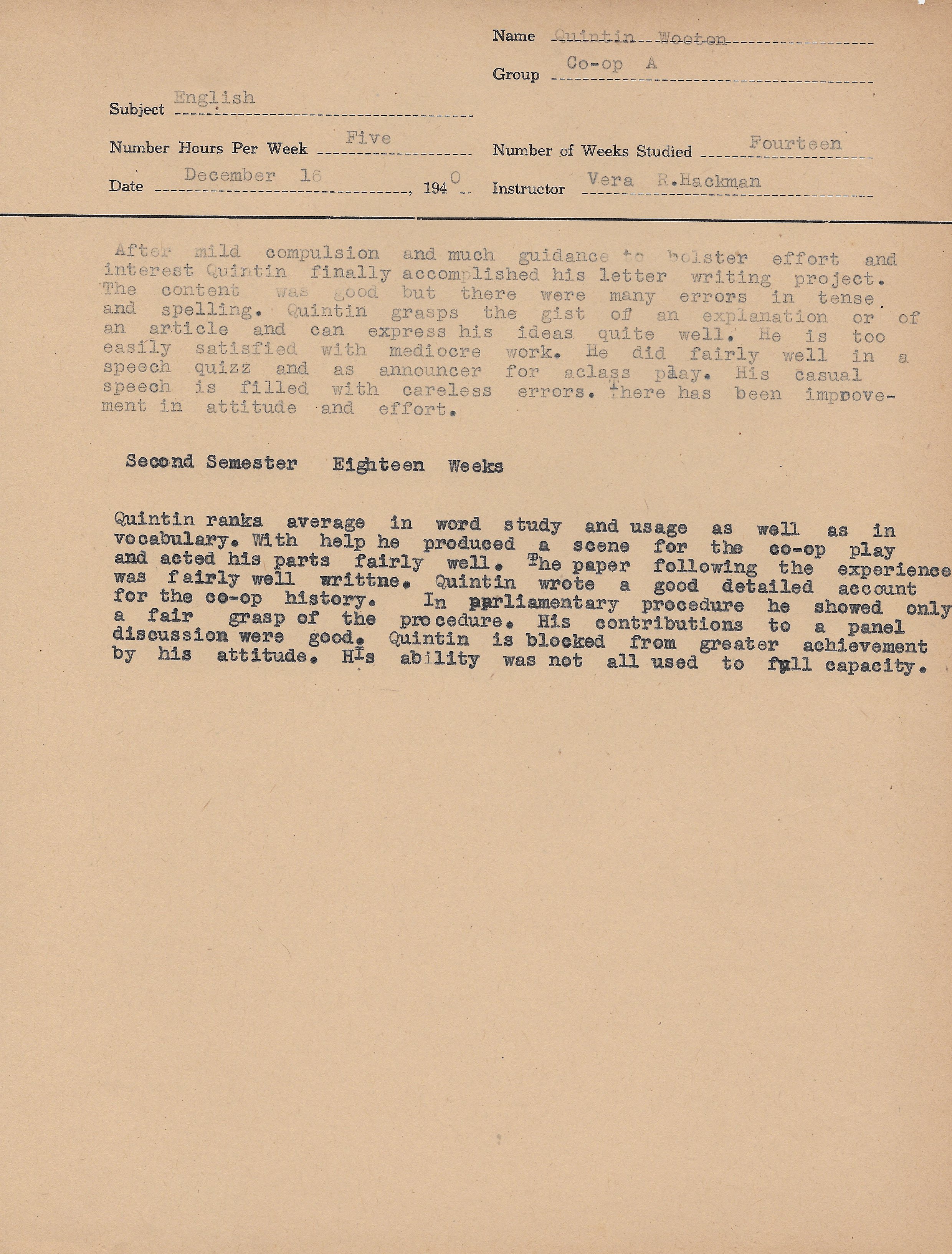 SCAN0301. December 18, 1940, and Second Semester, 1941 – Instructor’s report for Quinten Wooton for English. Instructor: Vera R. Hackman. 1st semester, 14 weeks.: “…Quinten grasps the gist of an explanation of an article and can express his ideas quite well….He did fairly well…as announcer for a class play….” 2nd semester, 18 weeks. Miss Hackman wrote :