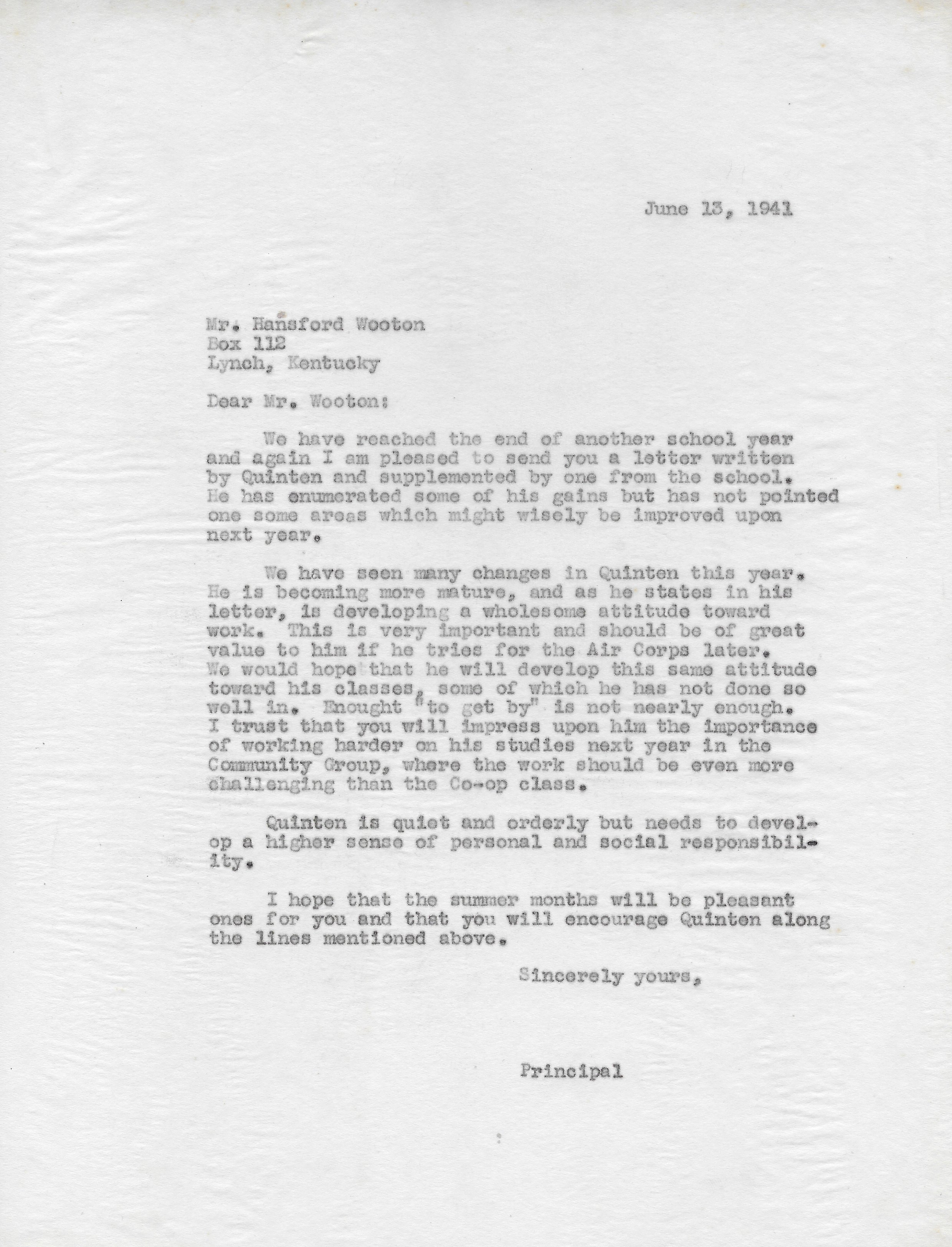 SCAN0313. June 13, 1941 – Carbon copy of typewritten letter to Mr. Wooton, Lynch, KY from Principal [unsigned]. Sending a letter written by Quinten and one from the School, describing his improved attitude and asking Mr. Wooton to “encourage” Quinten and “impress upon him the importance of working harder on his studies next year….”