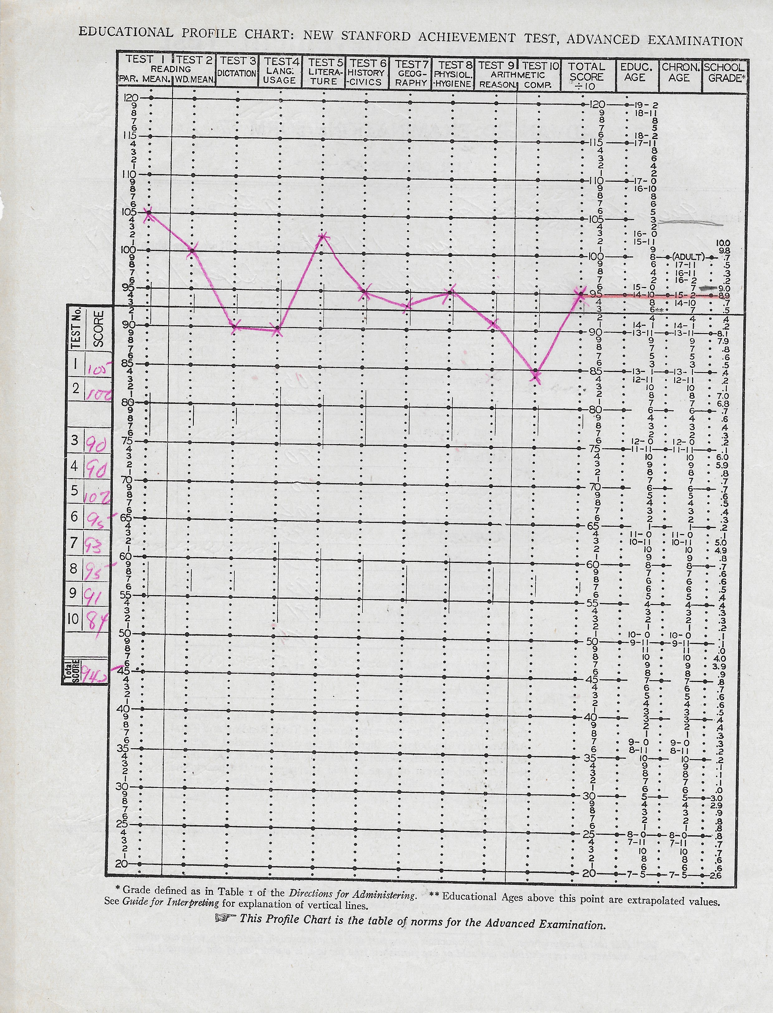 SCAN0319. September 16, 1940 – New Stanford Achievement Test (SAT) for Quinten Wooton, 9th grade, age 16. Lists scores for 10 tests and total score (average).