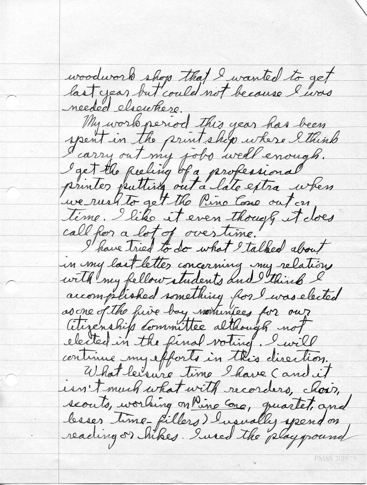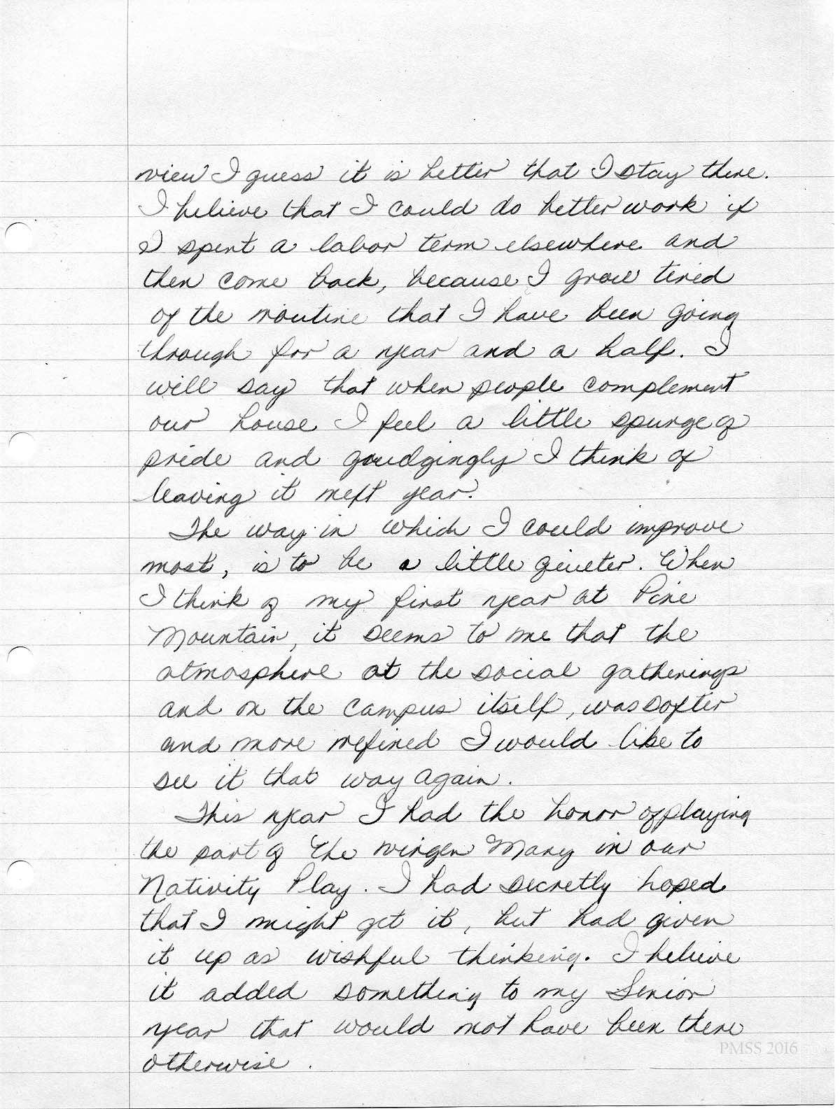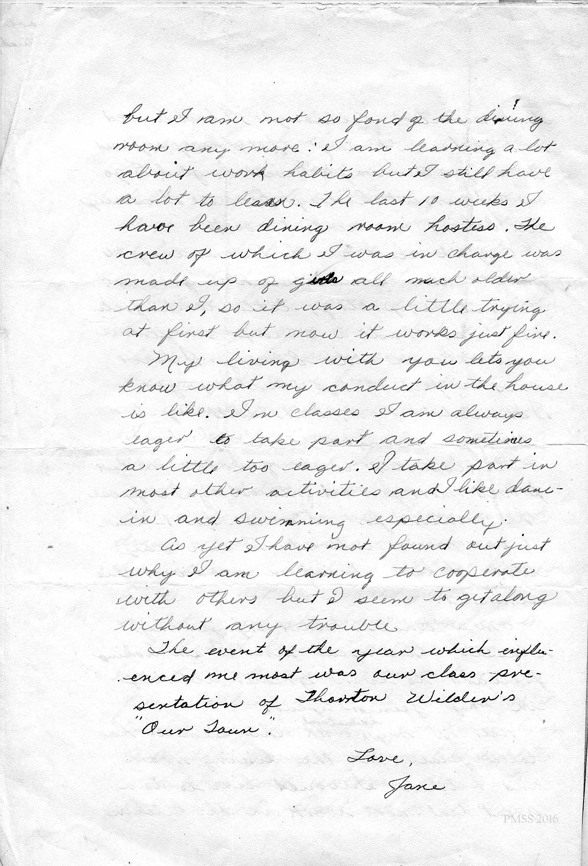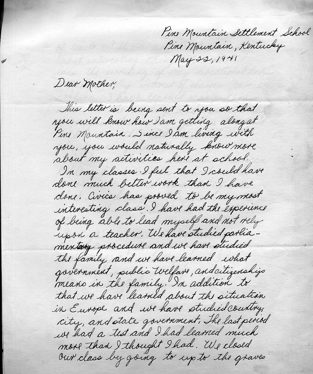 While at Pine Mountain all students in the program were required to write a self-report to be sent to parents. It was to reflect how the student saw their progress for the year. The following letters were written by Mary Jane and James Bishop to their mother Birdena Bishop. They were saved by Birdena in her Scrapbook assembled with highlights of her years at Pine Mountian (1940 – 1944) . The reports of her children represent the years of 1940-1943.