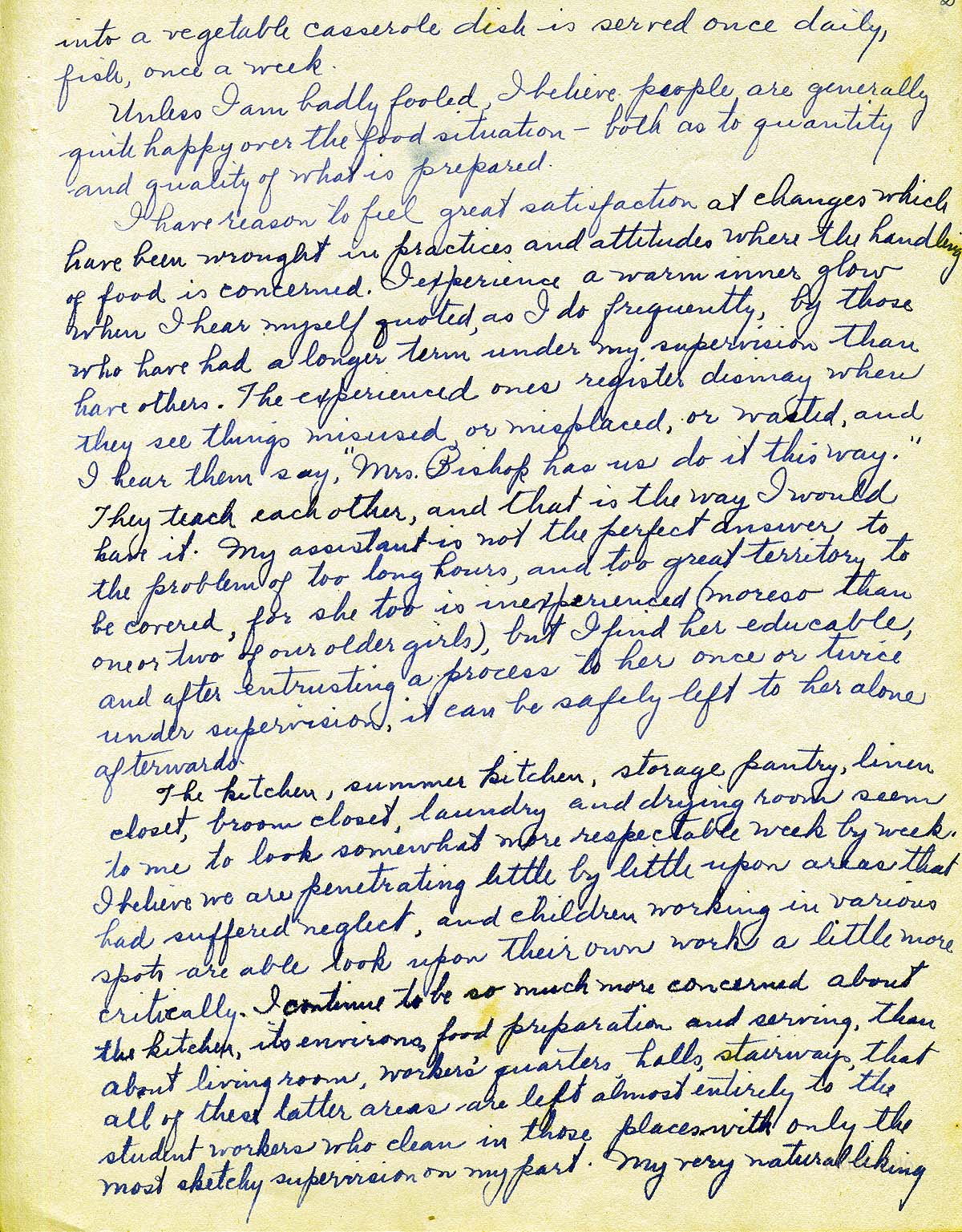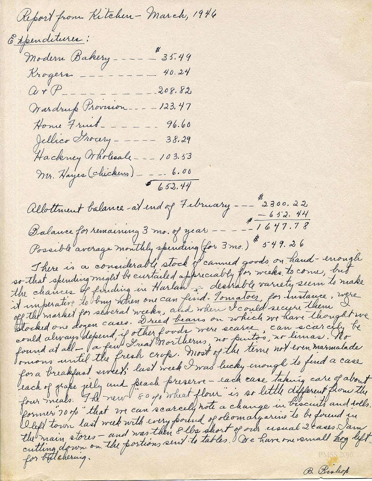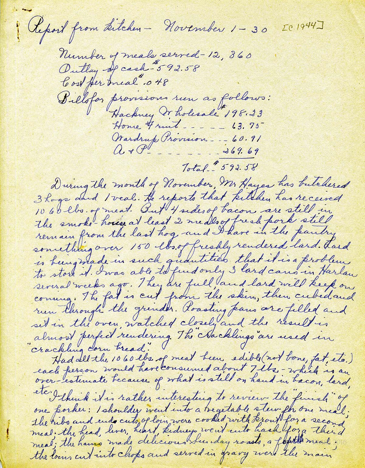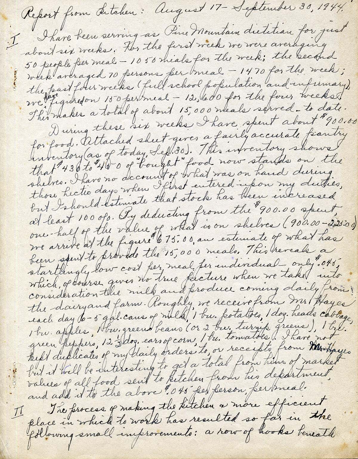 Birdena Bishop’s Kitchen Reports were prepared as part of her responsibilities as a dietician for Pine Mountain Settlement School in addition to her teaching responsibilities.   As the Dietician, she was required to report annually and monthly on the activity of the Kitchen. The reports are full of information on foods purchased, grown, prepared and manners at the table observed and all thing of consequence to managing the Kitchen at the School during the Boarding School years from 1940 to 1944. No small feat during the WWII years!