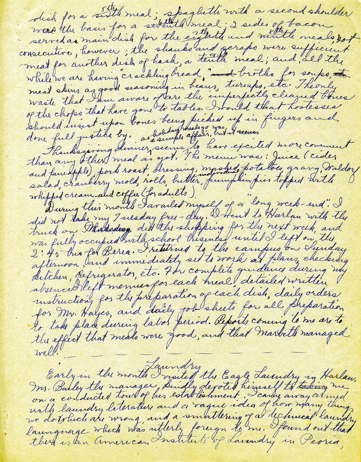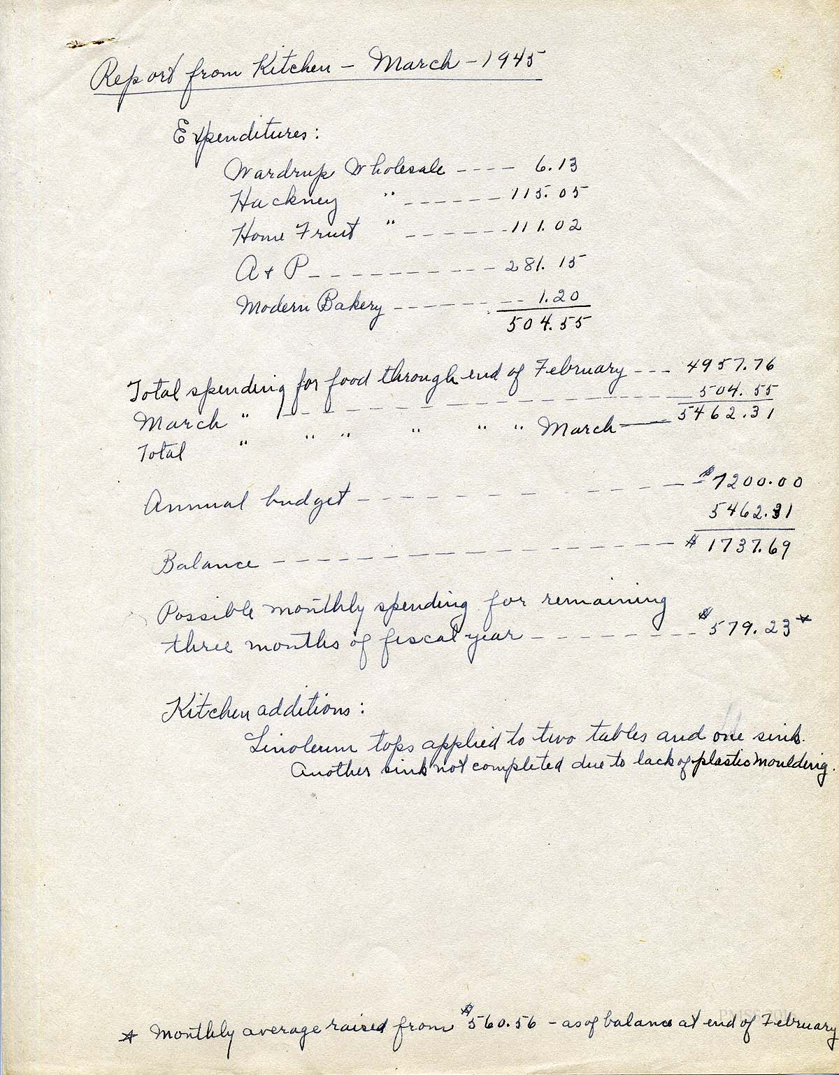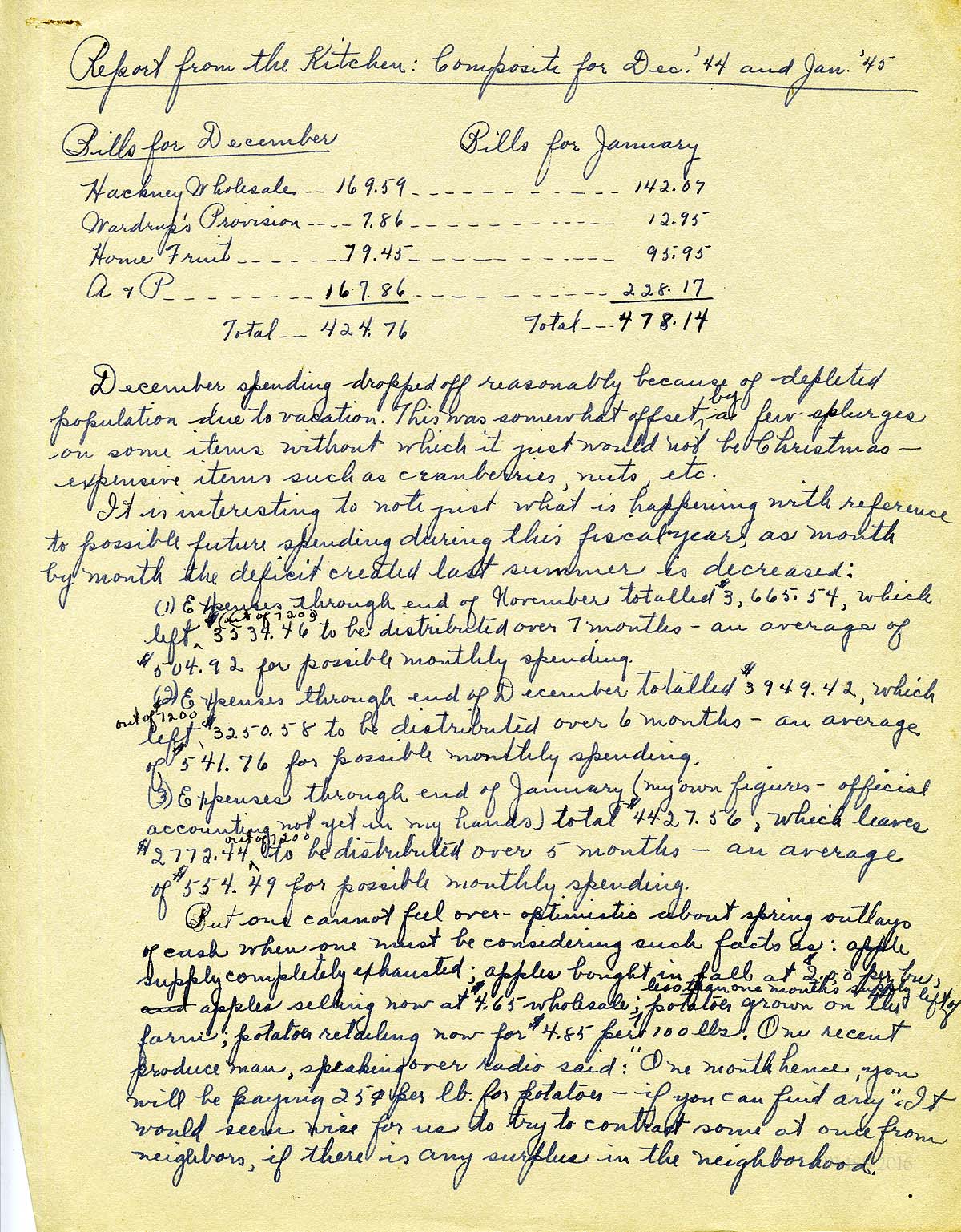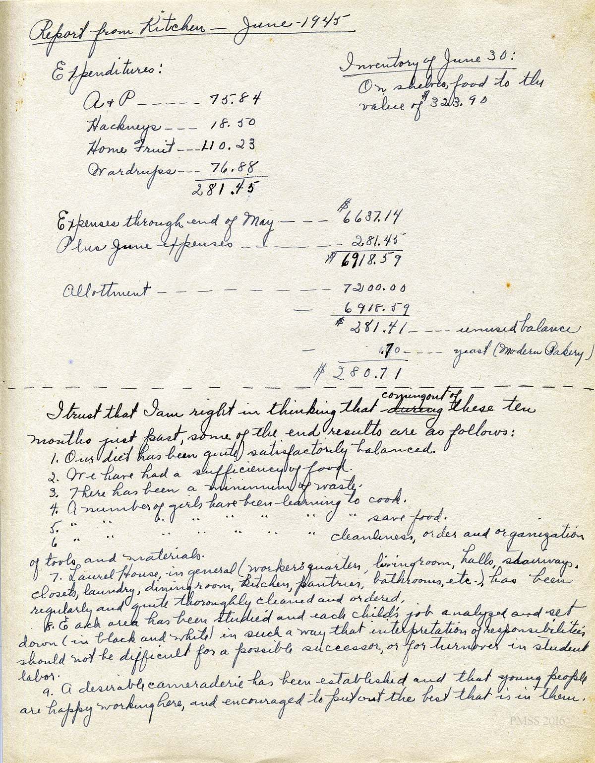 Birdena Bishop’s Kitchen Reports were prepared as part of her responsibilities as a dietician for Pine Mountain Settlement School in addition to her teaching responsibilities.   As the Dietician, she was required to report annually and monthly on the activity of the Kitchen. The reports are full of information on foods purchased, grown, prepared and manners at the table observed and all thing of consequence to managing the Kitchen at the School during the Boarding School years from 1940 to 1944. No small feat during the WWII years!