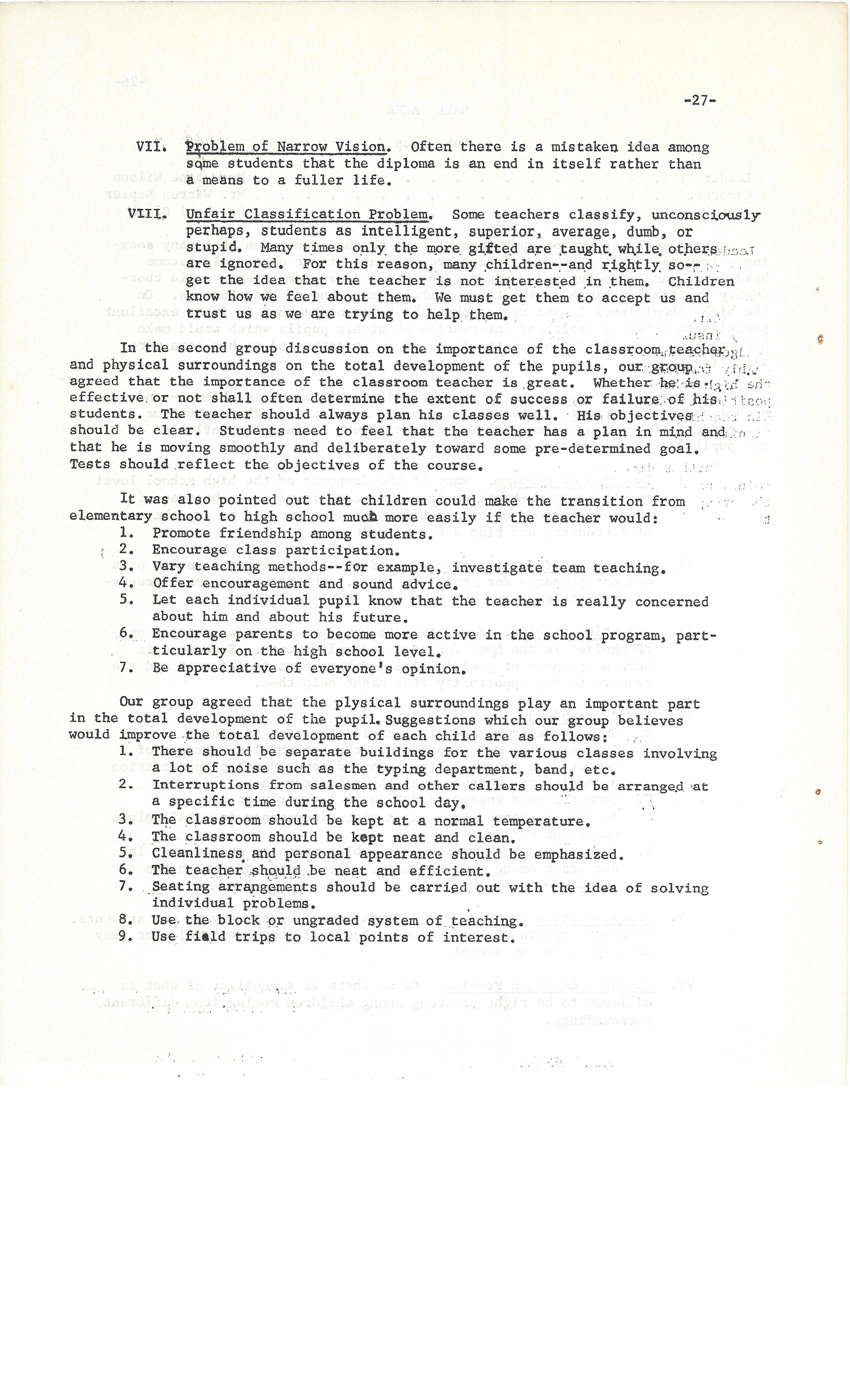 The group reaffirmed the idea brought out in the general session that the teacher is more important than the schedule, subjects or physical surroundings. If the horizons of the teacher are limited, he will do little to arouse an interest on the part of the pupil.