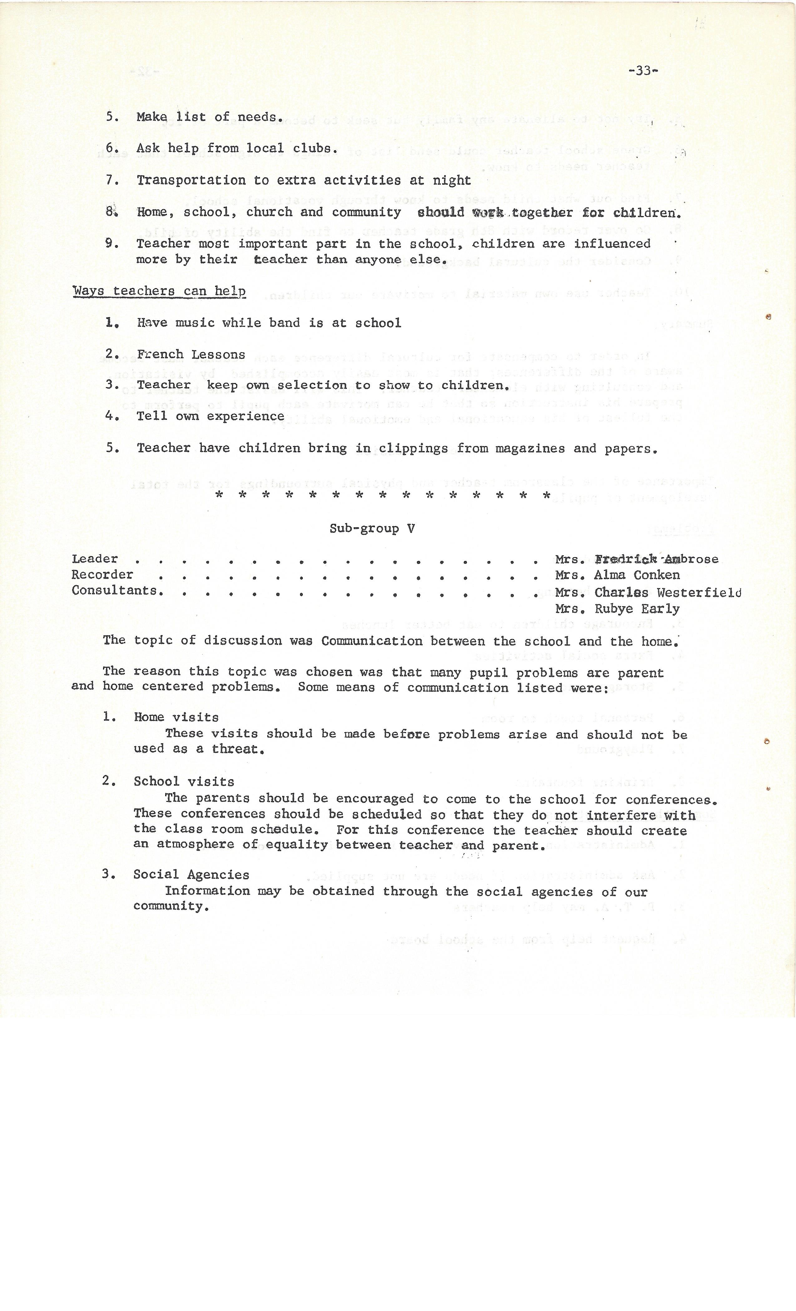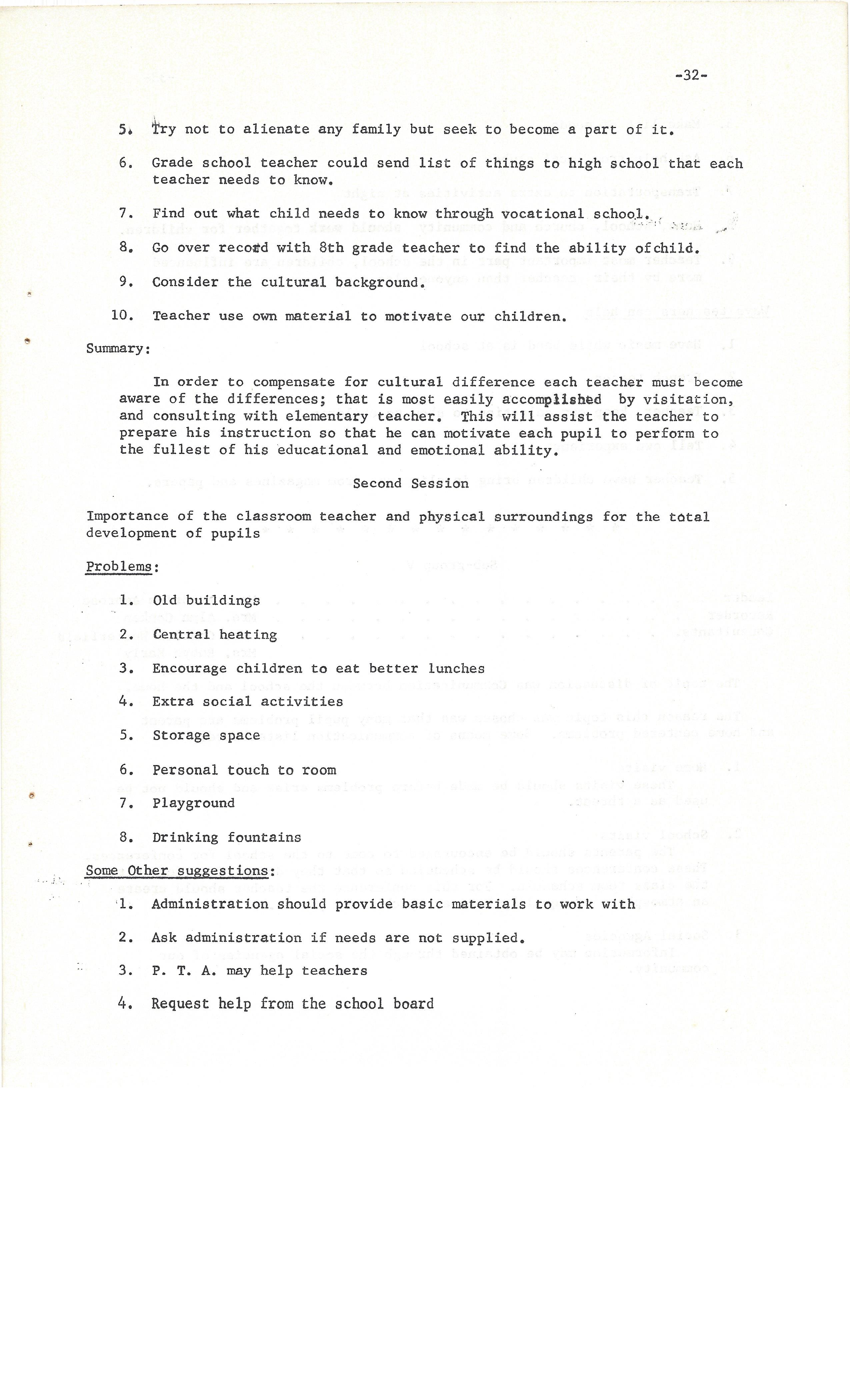 After much discussion, Sub Group I came to the conclusion that many seemingly insurmountable obstacles facing the students of our area could become bridges of understanding and appreciation if the classroom teacher would thoroughly familiarize himself with the cultural background of his students. On the high school level it was agreed that the homeroom teacher is in an excellent position to obtain a wealth of information about his pupils which would make his teaching more effective and the lives of those entrusted to his care more significant.