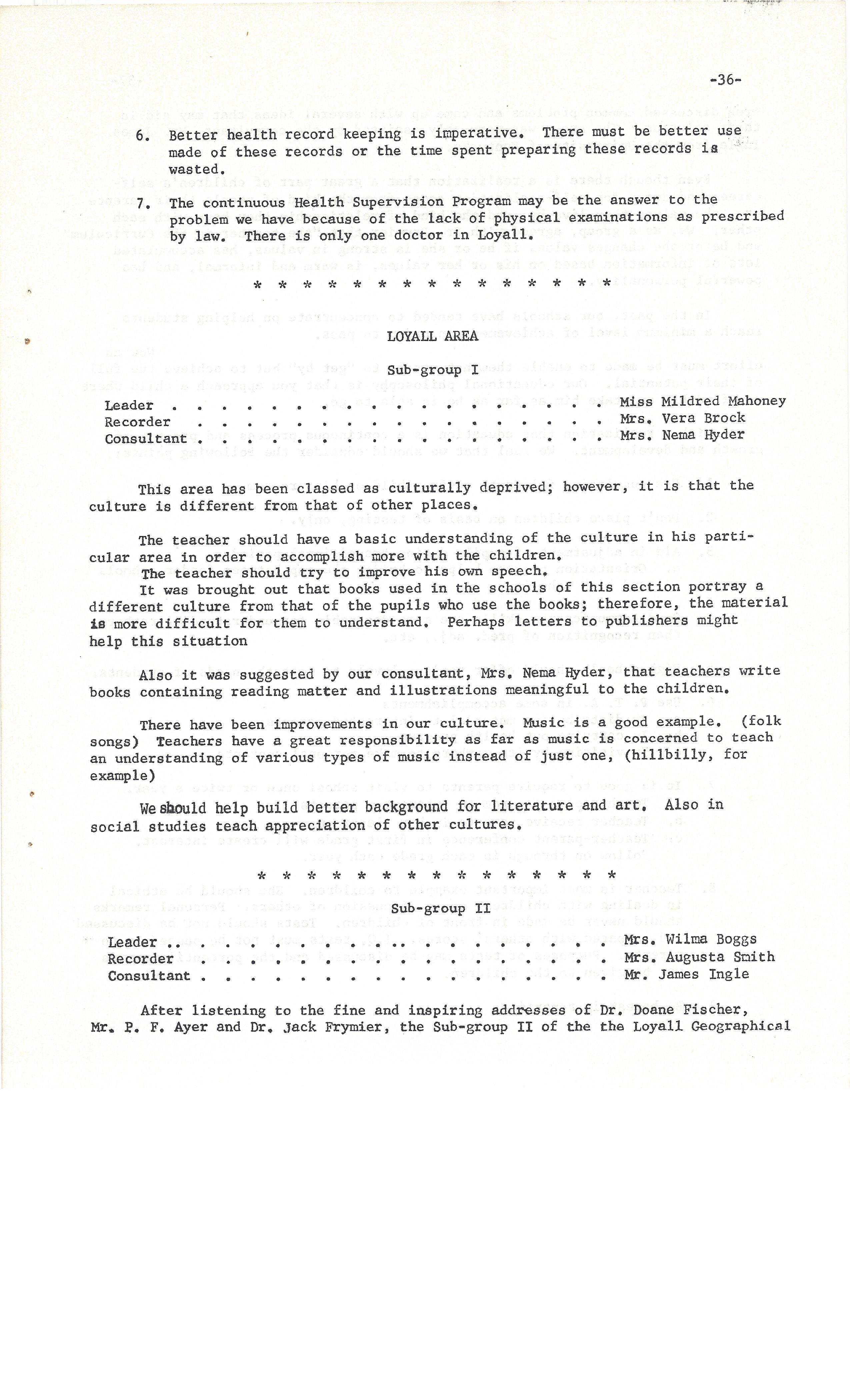 7. The continuous Health Supervision Program may be the answer to the problem we have because of the lack of physical examinations as prescribed by law. There is only one doctor in Loyall.