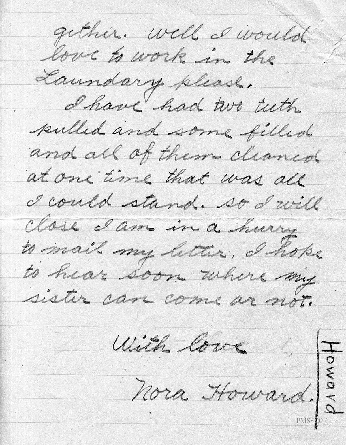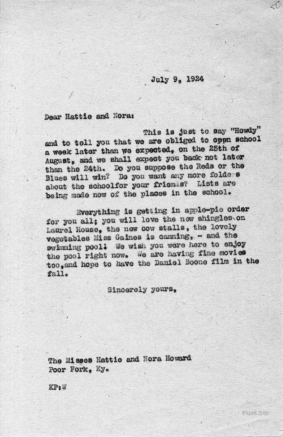 Although Nora was born in Partridge, Kentucky, (October 13, 1907), another record also shows her birthplace as Cumberland, Kentucky. She was admitted to Pine Mountain in 1921 when she was in the 4th grade. She was first placed on a waiting list but was then accepted. Also in 1921, Nora wrote to Katherine Pettit and appealed to Pine Mountain to allow her younger sister, Harriet, to also attend the School. Katherine Pettit noted that her sister was too young (under 14) to attend at the time. Hattie was finally admitted to join her sister in the Fall of 1922.