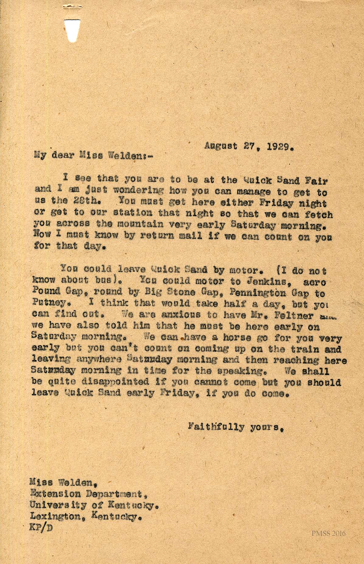 [008] August 27, 1929. Letter from Katherine Pettit to Mr. J.M. Feltner. of the Quicksand Agricultural Station of the University of Kentucky. Pettit advises Feltner of the best method of travel to the School and suggests that he pair with Miss Weldon to come to the School. She advises that if he comes by train over the mountain, that the open cars…”are much more attractive that the closed box car.” Pettit wants to know if the two of them can arrive by Friday night.