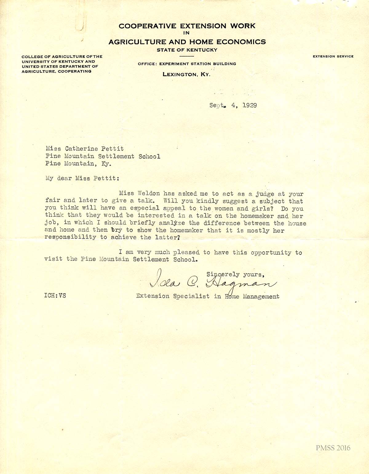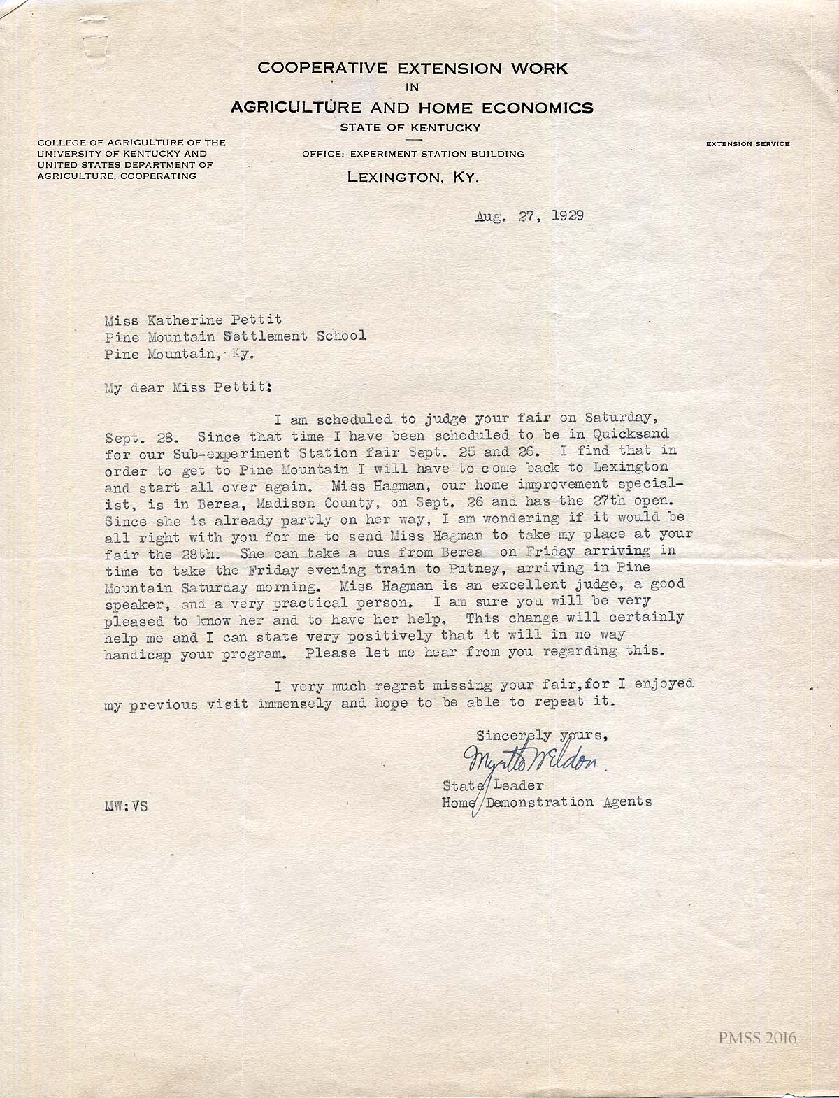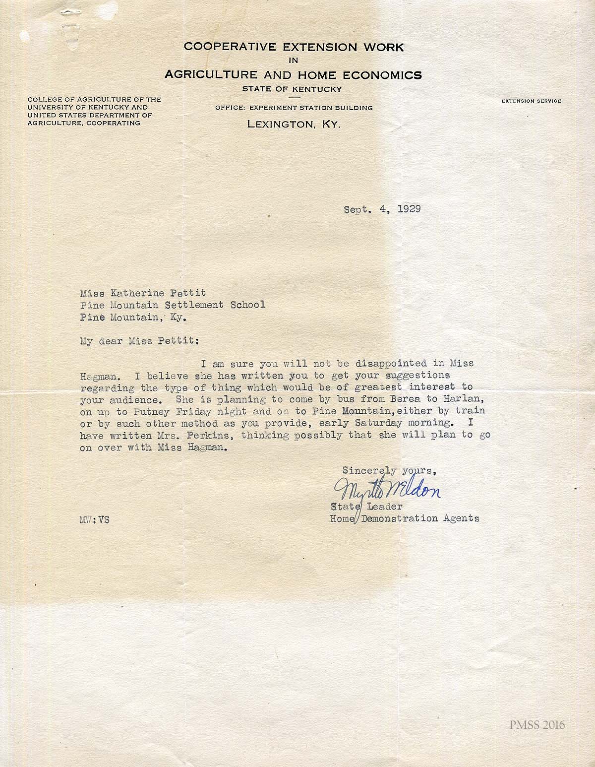 [014] September 4, 1929. Letter from Myrtle Weldon (State Leader, Home Demonstration Agents, Cooperative Extension Work in Agriculture and Home Economics, State of Kentucky, Lexington, Ky.) to Katherine Pettit. Assures Pettit of Hagman’s abilities and describes her travel plans. Weldon suggests that Hagman accompany Mrs. [Roxie] Perkins across the mountain.