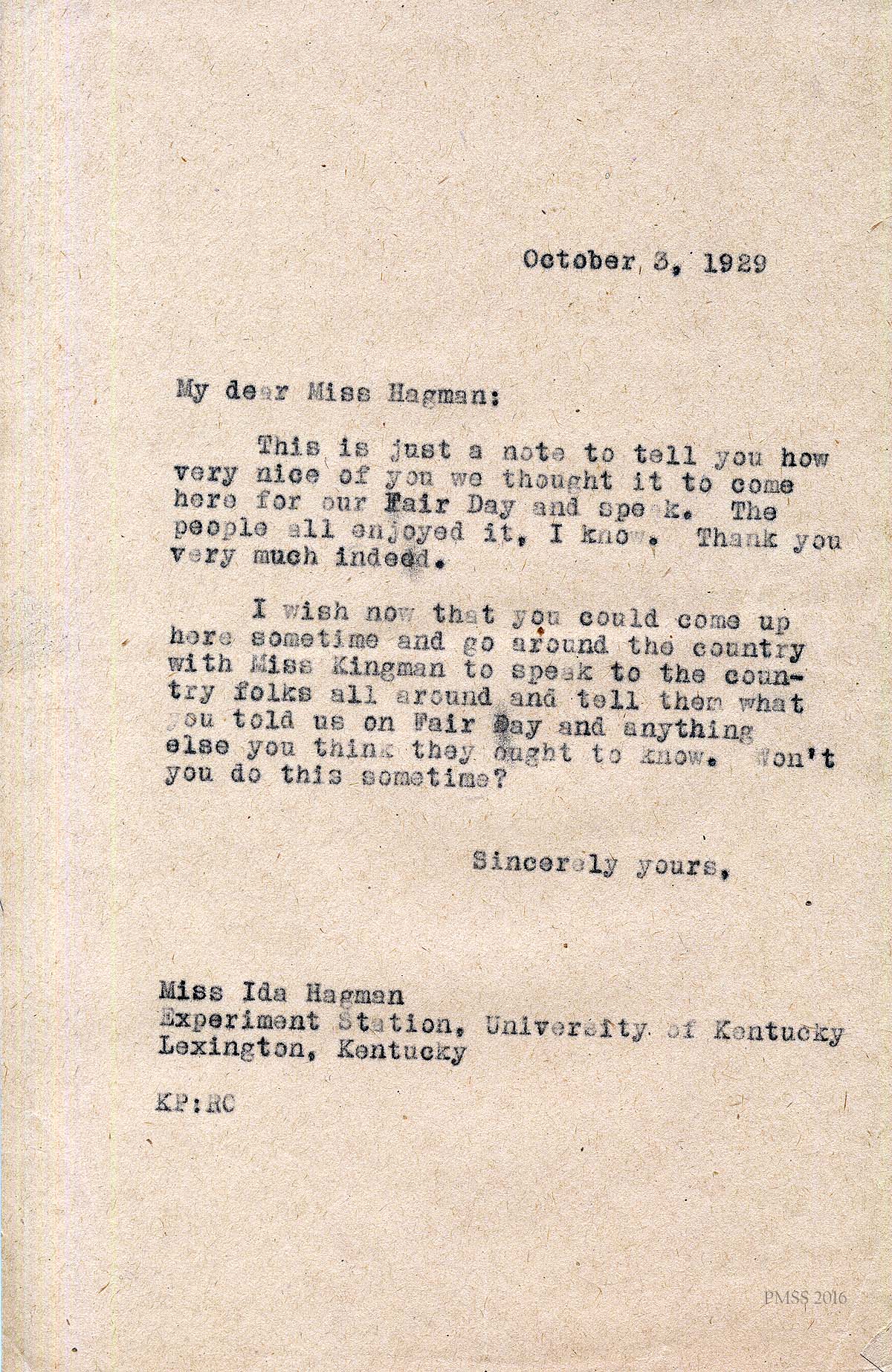 [013] October 3, 1929. Letter from Katherine Pettit to Ida Hagman. Pettit thanks Hagman for her speech at Fair Day and noted that the people enjoyed it. She asks Hagman “I wish now that you could come up here sometime and go around the country with Miss [Marian] Kingman to speak to the country folks all around and tell them what you told us on Fair Day and anything else you think they ought to know. Won’t you do this sometime?”