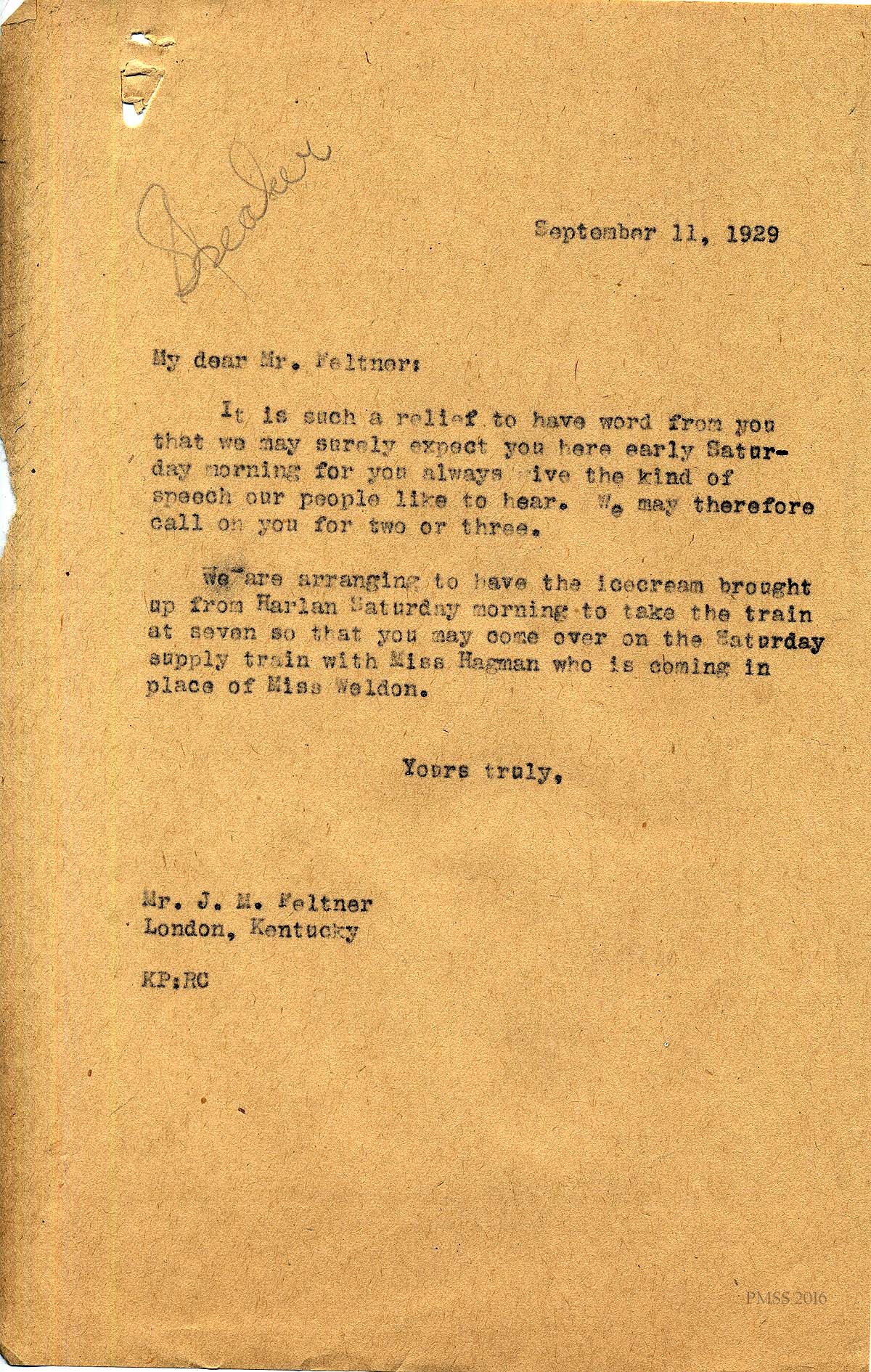 [015] September 11, 1929. Letter from Katherine Pettit to Mr. J.M. Feltner, London, Ky. Relieved he is speaking at Fair; provides supply train information.