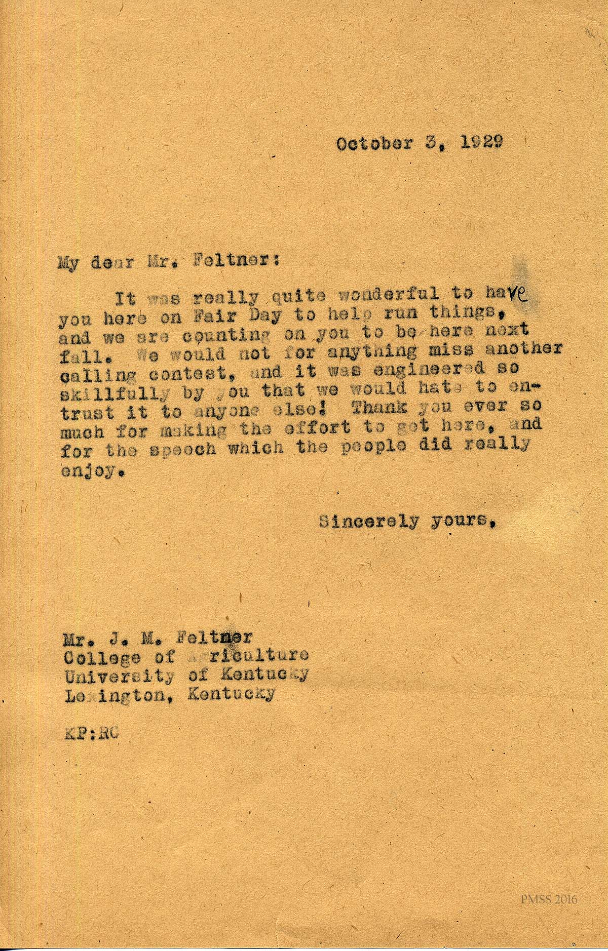 [019] October 3, 1929. Letter from Katherine Pettit to Mr. J. M. Feltner, College of Agriculture, University of Kentucky, Lexington, Ky. Thanks him for speaking at the Fair. “We would not for anything miss another calling contest, and it was engineered so skillfully by you….”