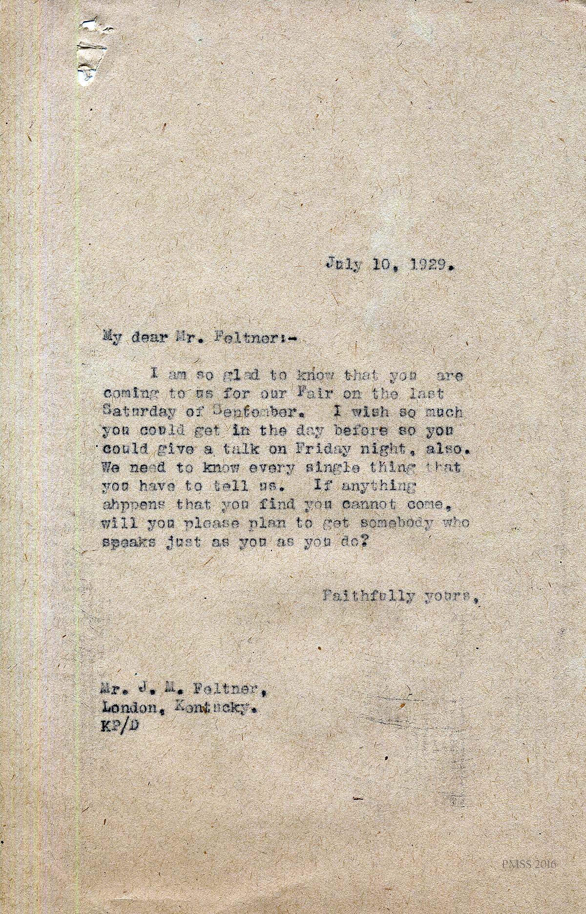 [004] July 10, 1929. Letter from Katherine Pettit to Mr. J.M. Feltner, London, KY. Pettit provides travel information for Feltner, a speaker at Fair Day, if he is able to make the trip.