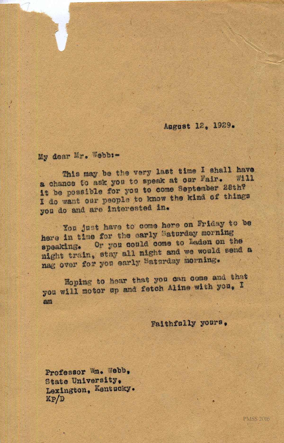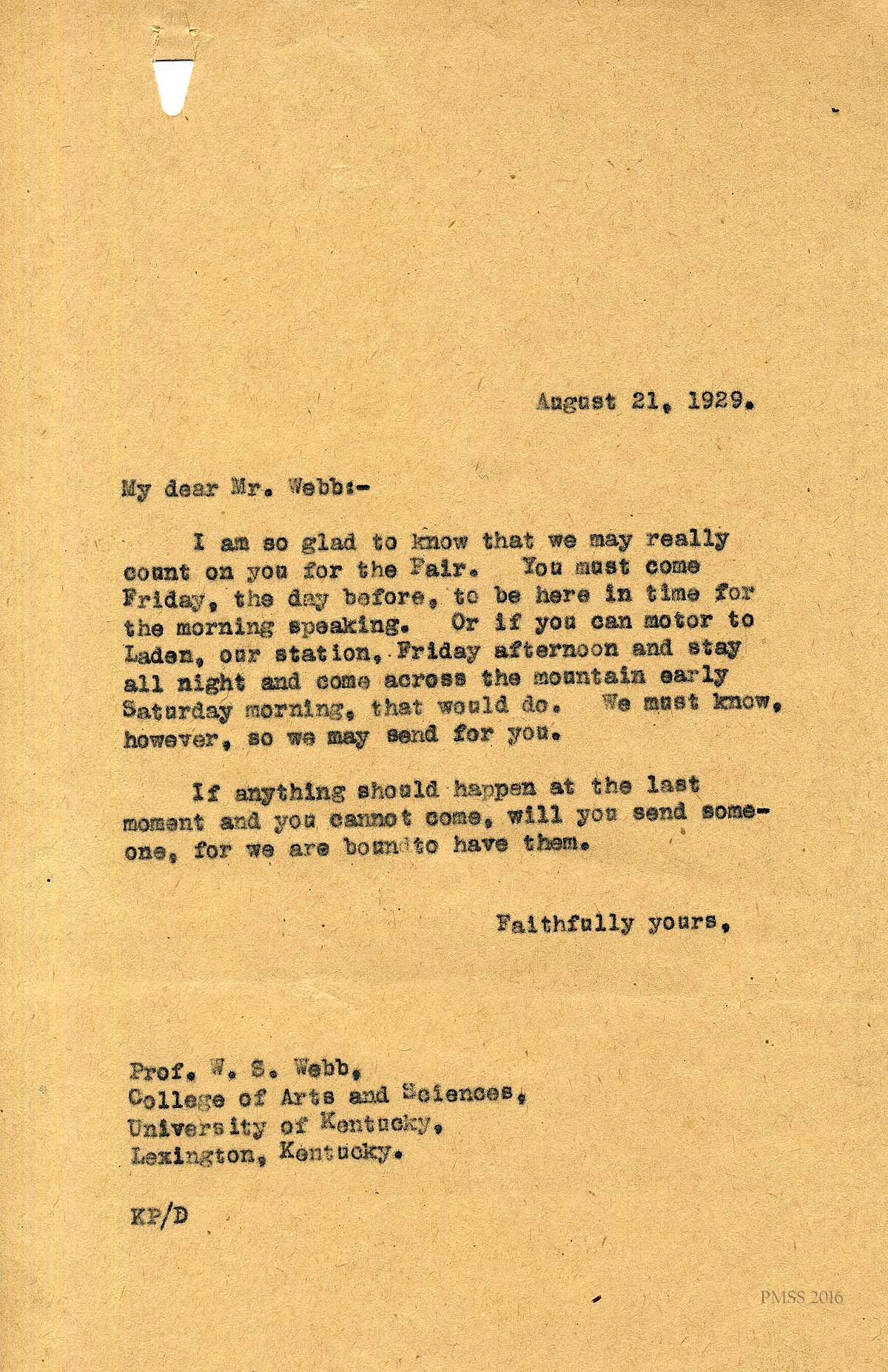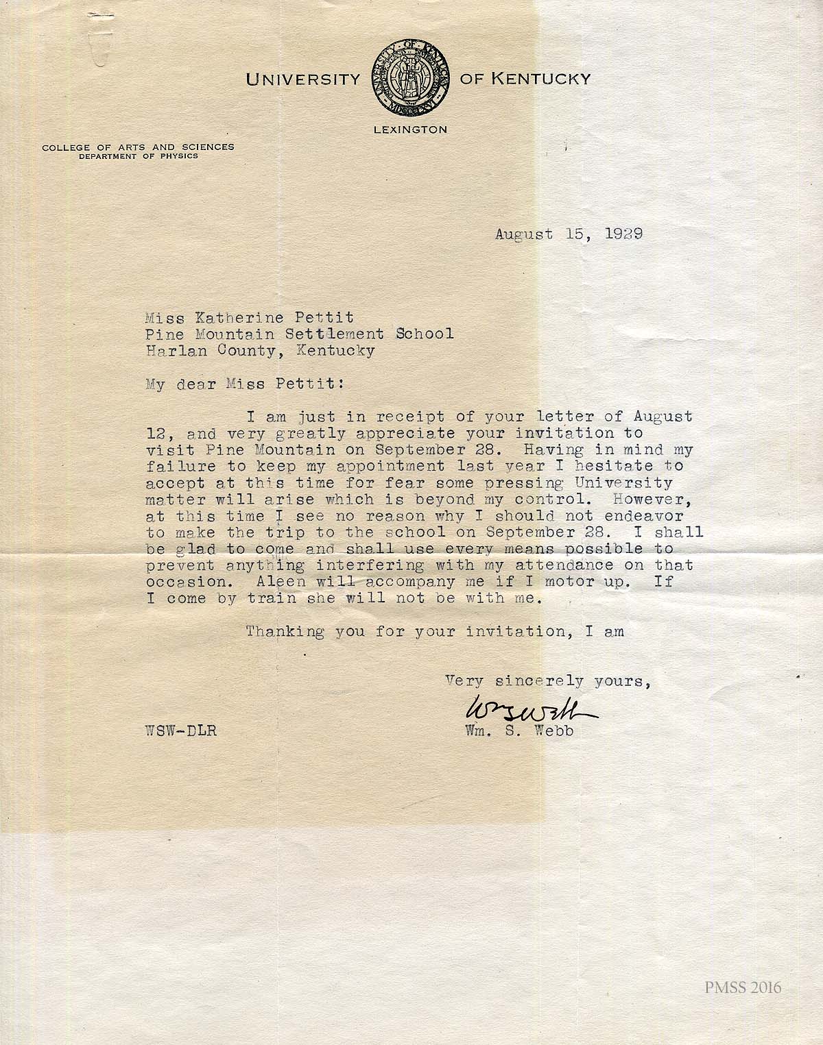 [005] August 15, 1929. Letter from William S. Webb, Professor in the College of Arts and Sciences, Department of Physics, University of Kentucky, to Katherine Pettit. Webb replies to Pettit that he will be able to speak at Fair Day but fears events may change on his end. He advises Pettit that his wife Aleen will accompany him to the School if by car but will not come if he comes by train.