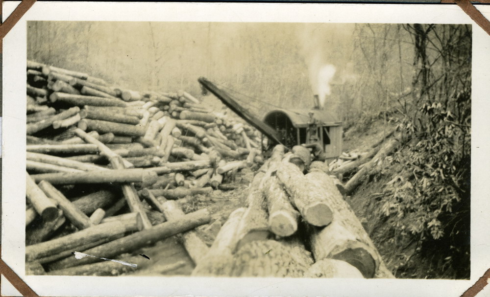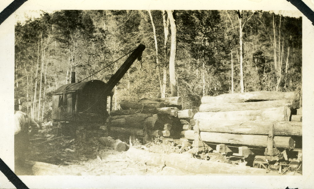 - Log loader and logs near PMSS. Bassett Album, c. 1928-29. [pmss_bas068.jpg]