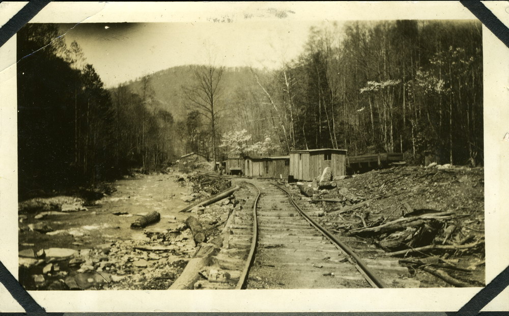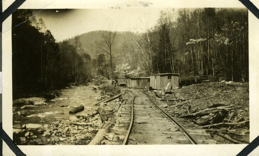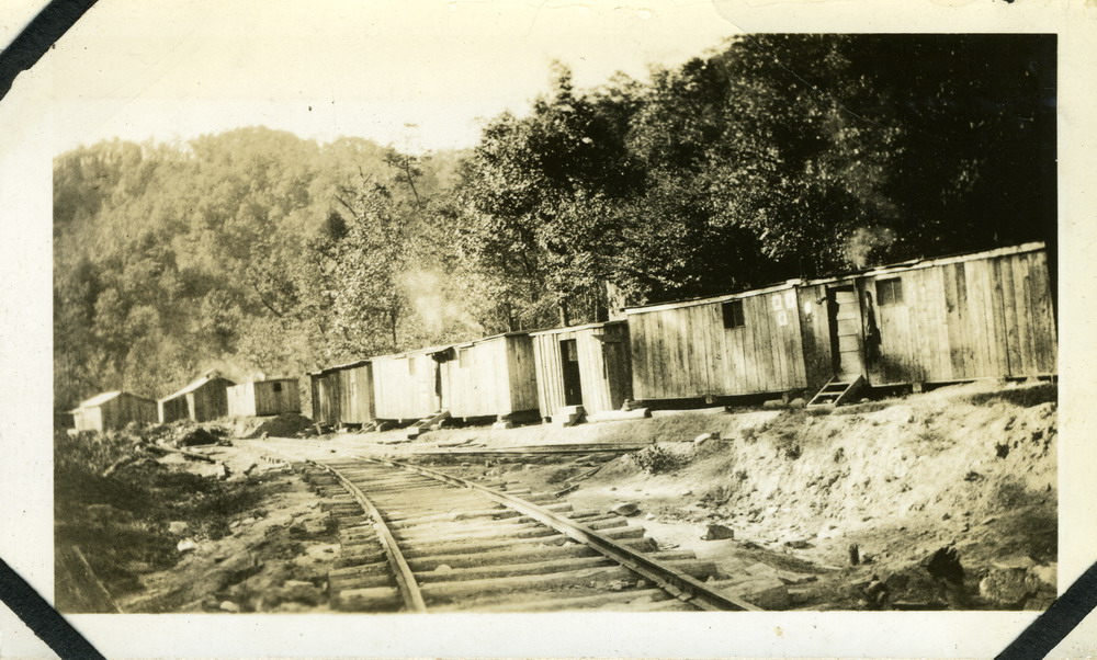 - Railroad near Pine Mountain with worker cabins to the right. Bassett Album, c. 1928-29. [pmss_bas071.jpg]
