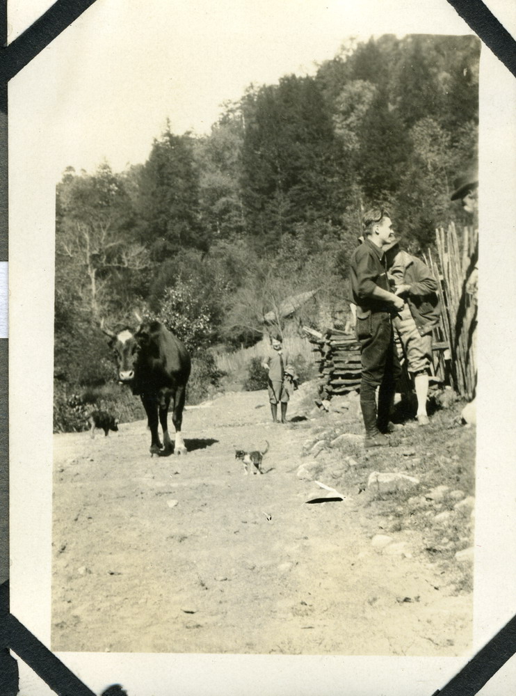 - PMSS staff visiting mountain family with cow on road. Bassett Album, c. 1928-29. [pmss_bas078.jpg]