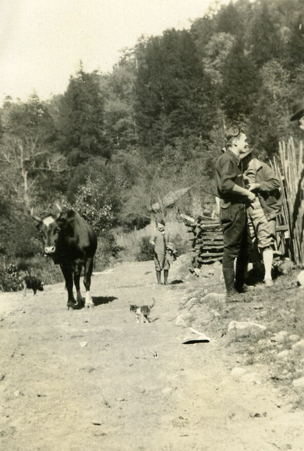 - PMSS staff visiting mountain family with cow on road. Bassett Album, c. 1928-29. [pmss_bas079.jpg]