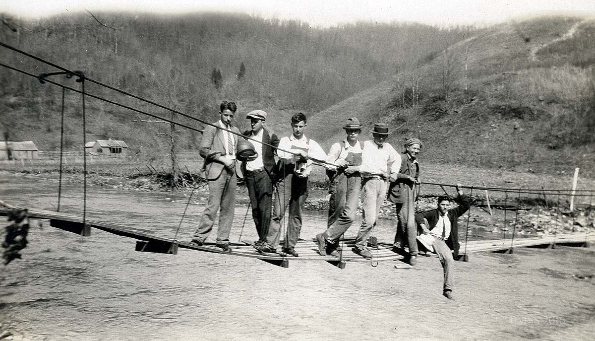 - Men on swinging bridge (Big Laurel?). Bassett Album, c. 1928-29. [pmss_bas091.jpg]