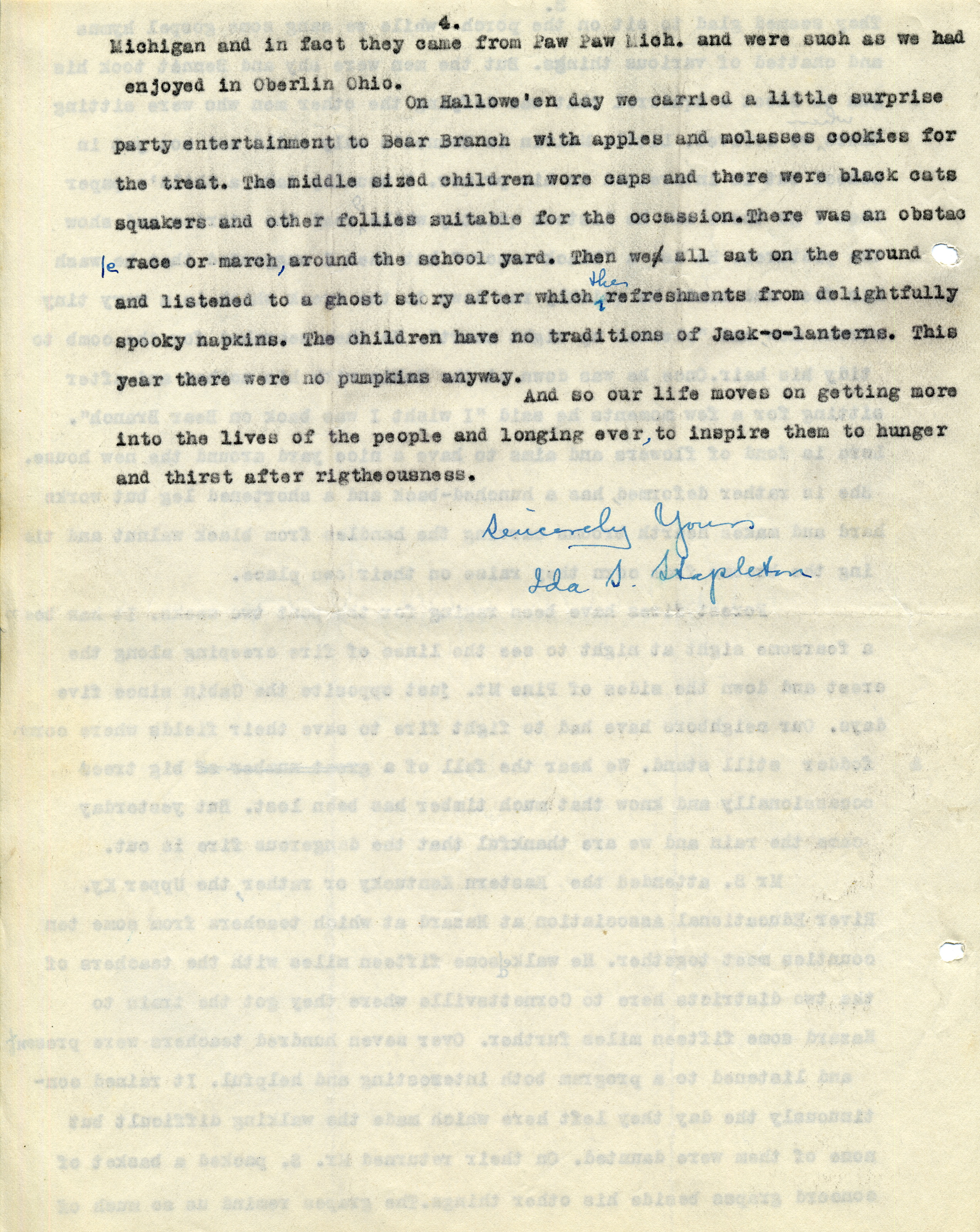 Dr. Ida Stapleton ; Rev. Robert Stapleton ; Pine Mountain Settlement School ; ministers ; Kentucky State WCTU ; Prohibition ; Bear Branch ; Francis Willard ; 23rd Psalm ; post offices ; pistols ; whiskey ; Granpap Hall ; Child’s paper ; Cabin ; hearth brooms ; broom corn ; forest fires ; River Educational Association ; concord grapes ; Halloween ; obstacle races ; ghost stories ; Jack-o-lanterns ; pumpkins ; Miss Pettit ; hospitals ; Ora Dickson Smith ; Joan Cornett ; Line Fork, KY ; Corbin, KY ; Pineville, KY ; Gilley, KY ; Hazard, KY ; Cornettsville , KY ; Paw Paw, MI ; Oberlin, OH ; Letcher County, KY ;