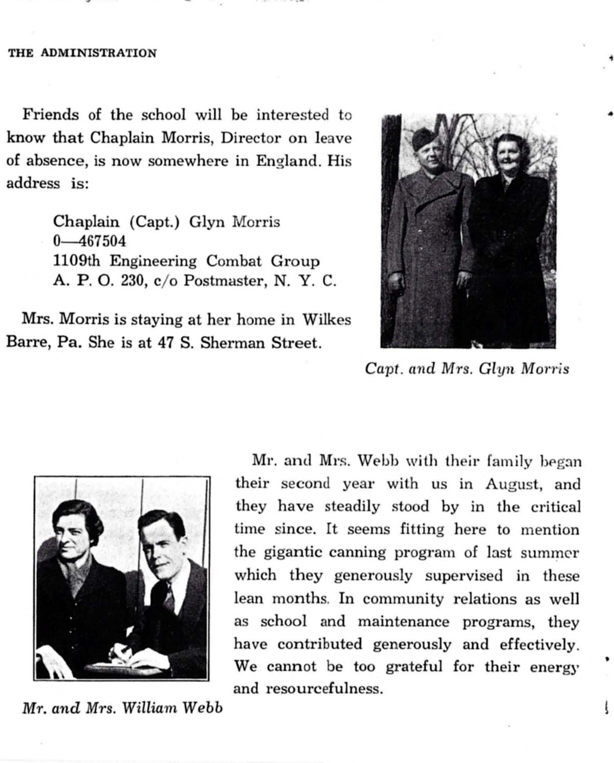 Mr. and Mrs. [William D.] Webb with their family began their second year with us in August, and they have steadily stood by in the critical time since. It seems fitting here to mention the gigantic canning program of last summer which they generously supervised in these lean months. In community relations as well as school and maintenance programs, they have contributed generously and effectively. We cannot be too grateful for their energy and resourcefulness.