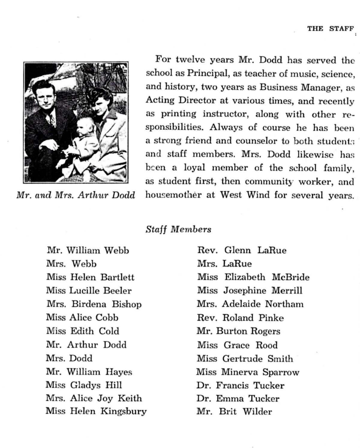 For twelve years Mr. [Arthur] Dodd has served the school as Principal, as teacher of music, science, and history, two years as Business Manager, as Acting Director at various times, and recently as printing instructor, along with other responsibilities. Always of course he has been a strong friend and counselor to both student and staff members, Mrs. Dodd likewise has been a loyal member of the school family, as student first, then community worker, and housemother at West Wind for several years.