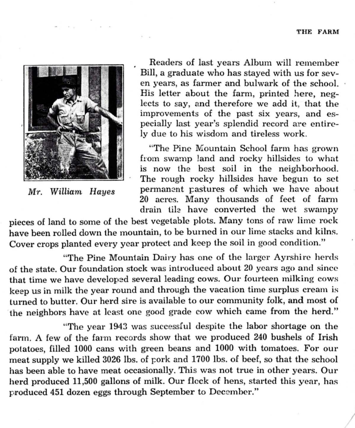 Readers of last year’s Album will remember Bill [Hayes], a graduate who has stayed with us for seven years, as farmer and bulwark of the school. His letter about the farm, printed here, neglects to say, and therefore we add it, that the improvements of the past six years, and especially last year’s splendid record are entirely due to his wisdom and tireless work.