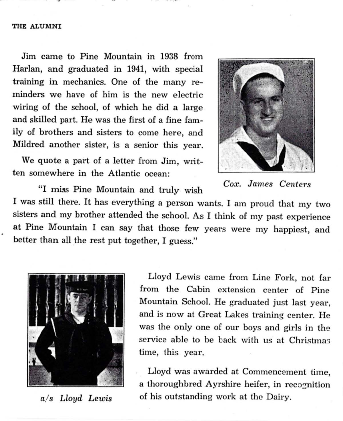 Jim [Centers] came to Pine Mountain in 1938 from Harlan, and graduated in 1941, with special training in mechanics. One of the many reminders we have of him is the new electric wiring of the school, of which he did a large and skilled part. He was the first of a fine family of brothers and sisters to come here, and Mildred, another sister, is a senior this year.