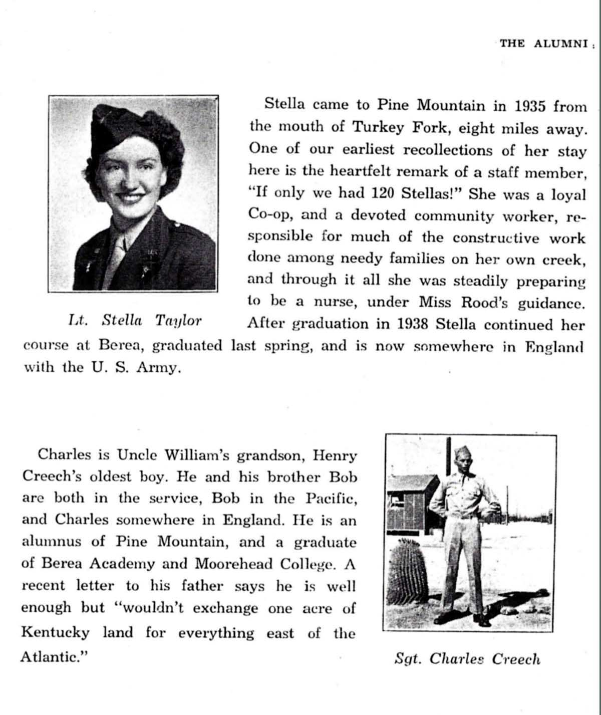 Stella [Taylor] came to Pine Mountain in 1935 from the mouth of Turkey Fork, eight miles away. One of our earliest recollections of her stay here is the heartfelt remark of a staff member, “If only we had 120 Stellas!” She was a loyal Co-op, and a devoted community worker, responsible for much of the constructive work done among needy families on her own creek, and through it all she was steadily preparing to be a nurse, under Miss [Grace] Rood‘s guidance. After graduation in 1938 Stella continued her course at Berea, graduated last spring, and is now somewhere in England with the U. S. Army.