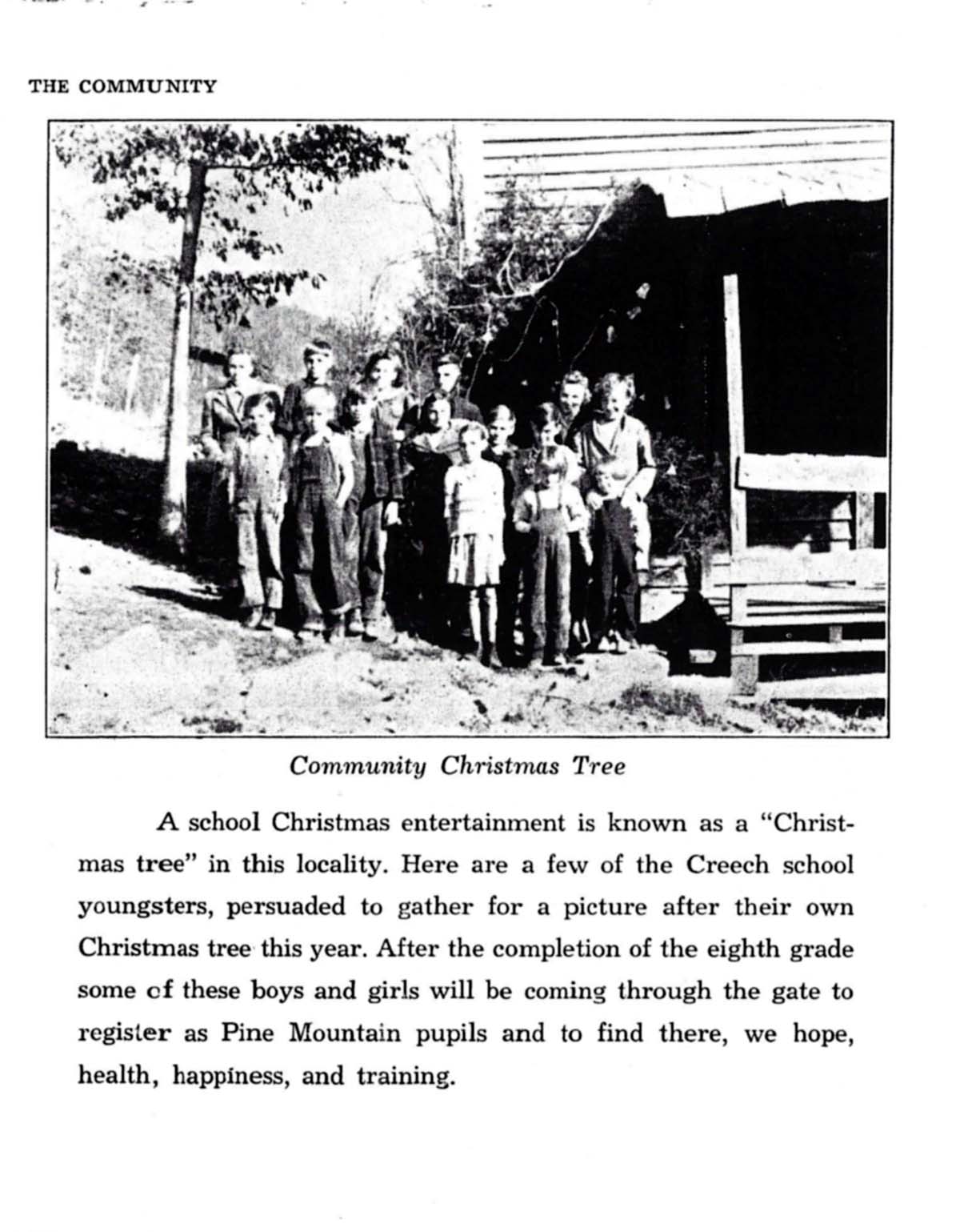 A school Christmas entertainment is known as a “Christmas tree” in this locality. Here are a few of the Creech school youngsters, persuaded to gather for a picture after their own Christmas tree this year. After the completion of the eighth grade some of these boys and girls will be coming through the gate to register as Pine Mountain pupils and to find there, we hope, health, happiness, and training.