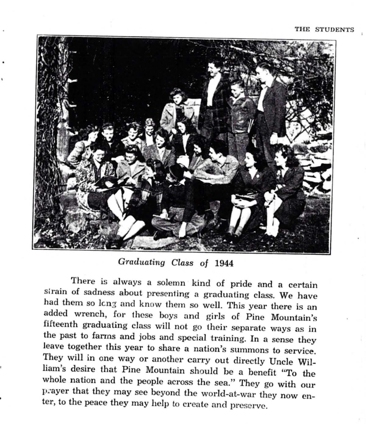 There is always a solemn kind of pride and a certain strain of sadness about presenting a graduating class. We have had them so long and know them so well. This year there is an added wrench, for these boys and girls of Pine Mountain’s fifteenth graduating class will not go their separate ways as in the past to farms and jobs and special training. In a sense they leave together this year to share a nation’s summons to service. They will in one way or another carry out directly Uncle William‘s desire that Pine Mountain should be a benefit “To the whole nation and the people across the sea…” They go with our prayer that they may see beyond the world-at-war they now enter, to the peace they may help to create and preserve.