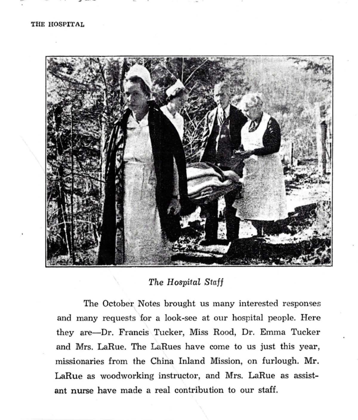 The October [1943] Notes brought us many interested responses and many requests for a look-see at our hospital people. Here they are — Dr. Francis Tucker, Miss [Grace] Rood, Dr. Emma Tucker and Mrs. LaRue. The LaRues have come to us just this year, missionaries from the China Inland Mission, on furlough. Mr. LaRue, as woodworking instructor, and Mrs. LaRue, as assistant nurse, have made a real contribution to our staff.