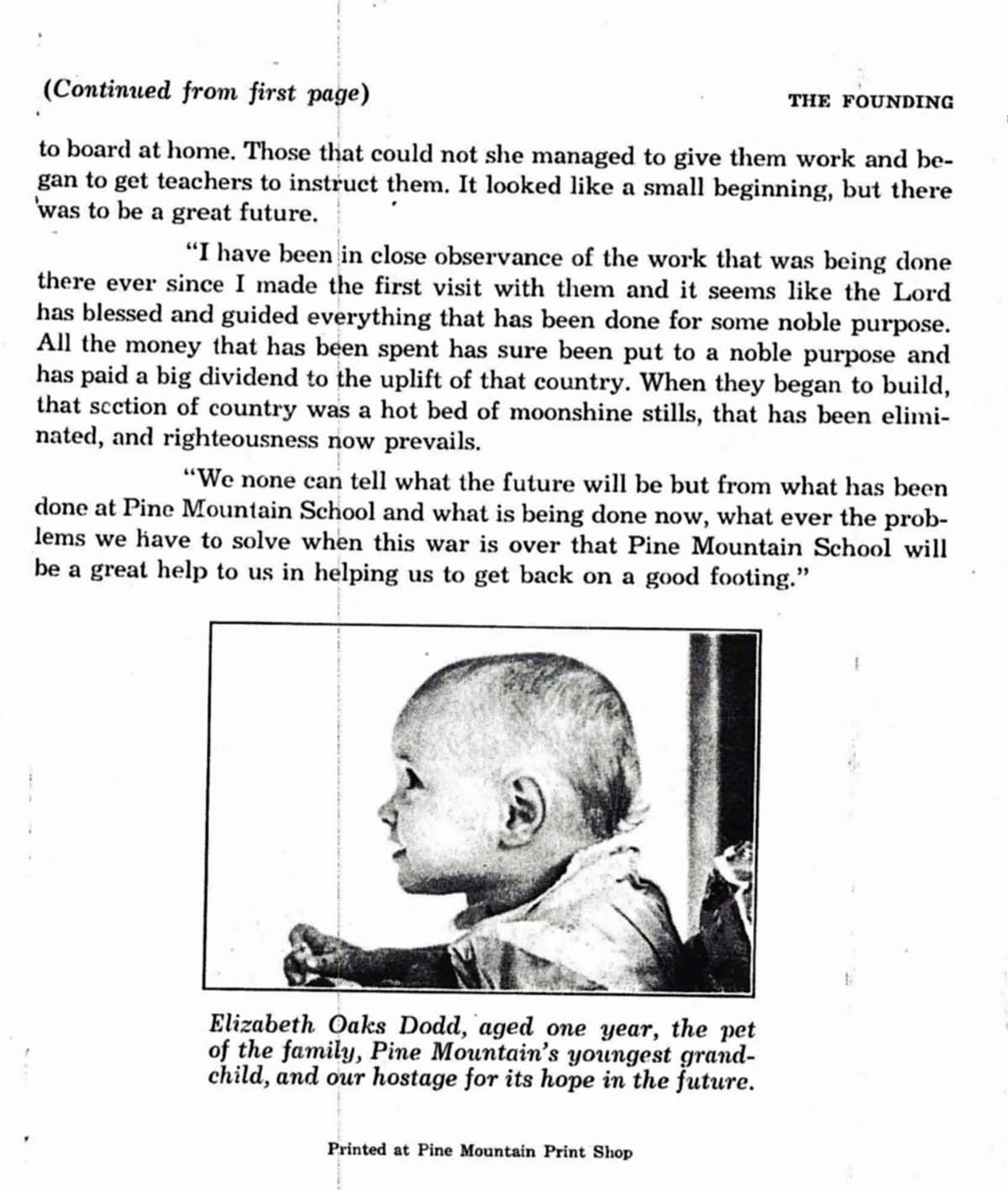 [Photo caption: Elizabeth Oaks Dodd, aged one year, the pet of the family, Pine Mountain’s youngest grandchild, and our hostage for its hope in the future.]