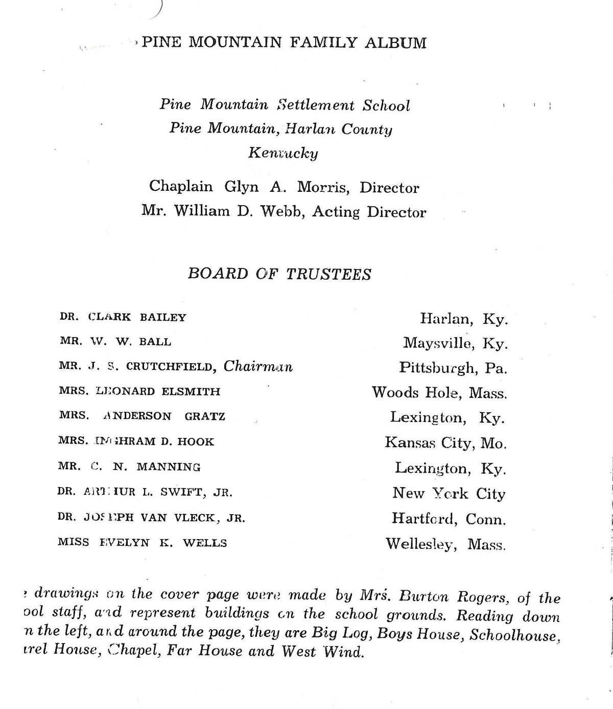 TAGS: Ephemera, Pine Mountain 1944 Family Album, Pine Mountain Settlement School publications, biographies, narratives, photograph, drawings, founding of PMSS, PMSS Board of Trustees list, PMSS staff list, PMSS farm, PMSS alumni, Creech School students, 1944 graduating class, hospital staff
