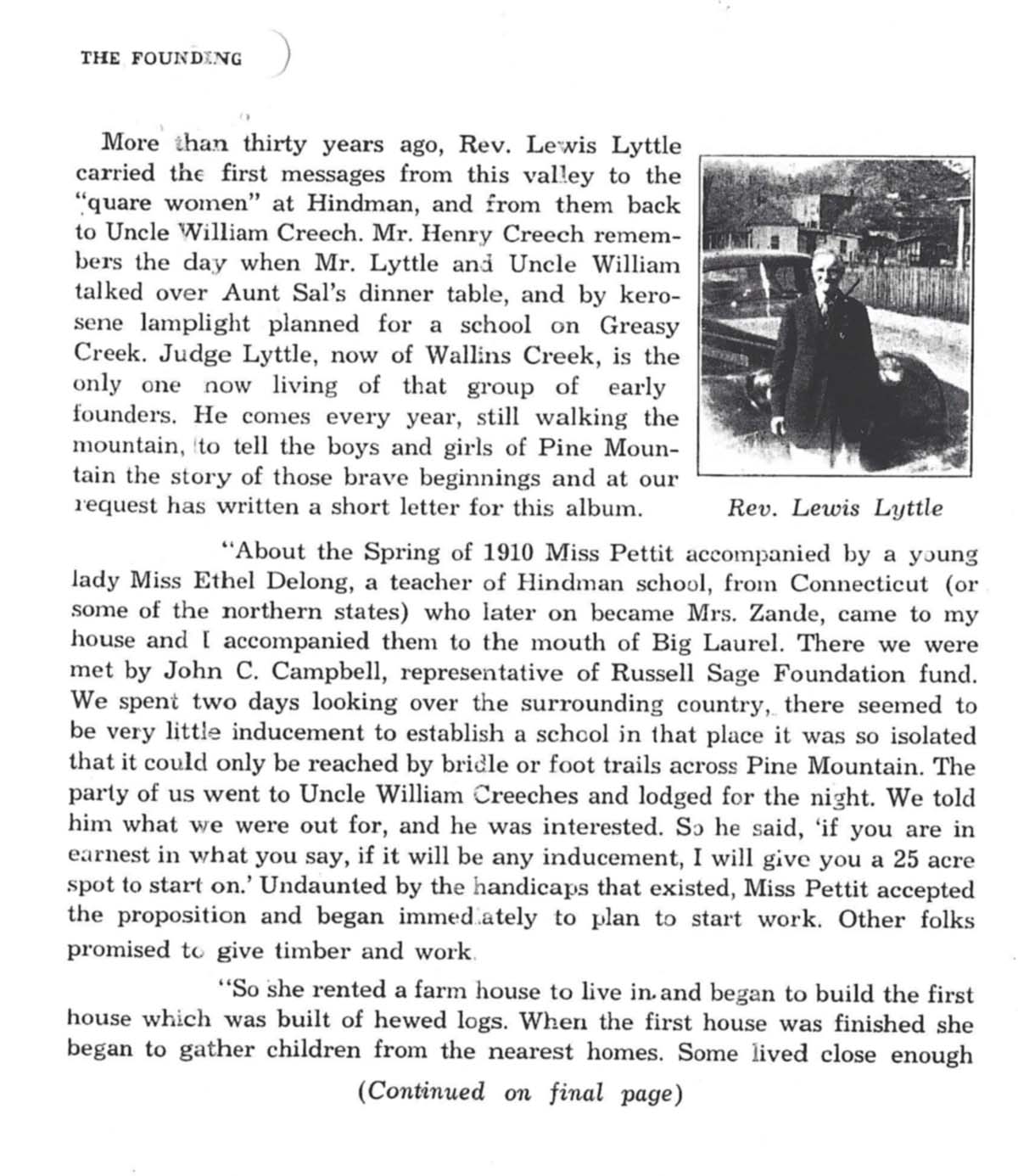 More than thirty years ago, Rev. Lewis Lyttle carried the first messages from this valley to the “quare women” at Hindman, and from them back to Uncle William Creech. Mr. Henry Creech remembers the day when Mr. Lyttle and Uncle William talked over Aunt Sal‘s dinner table, and by kerosene lamplight planned for a school on Greasy Creek. Judge Lyttle, now of Wallins Creek, is the only one now living of that group of early founders. He comes every year, still walking the mountain, to tell the boys and girls of Pine Mountain the story of those brave beginnings and at our request has written a short letter for this album.