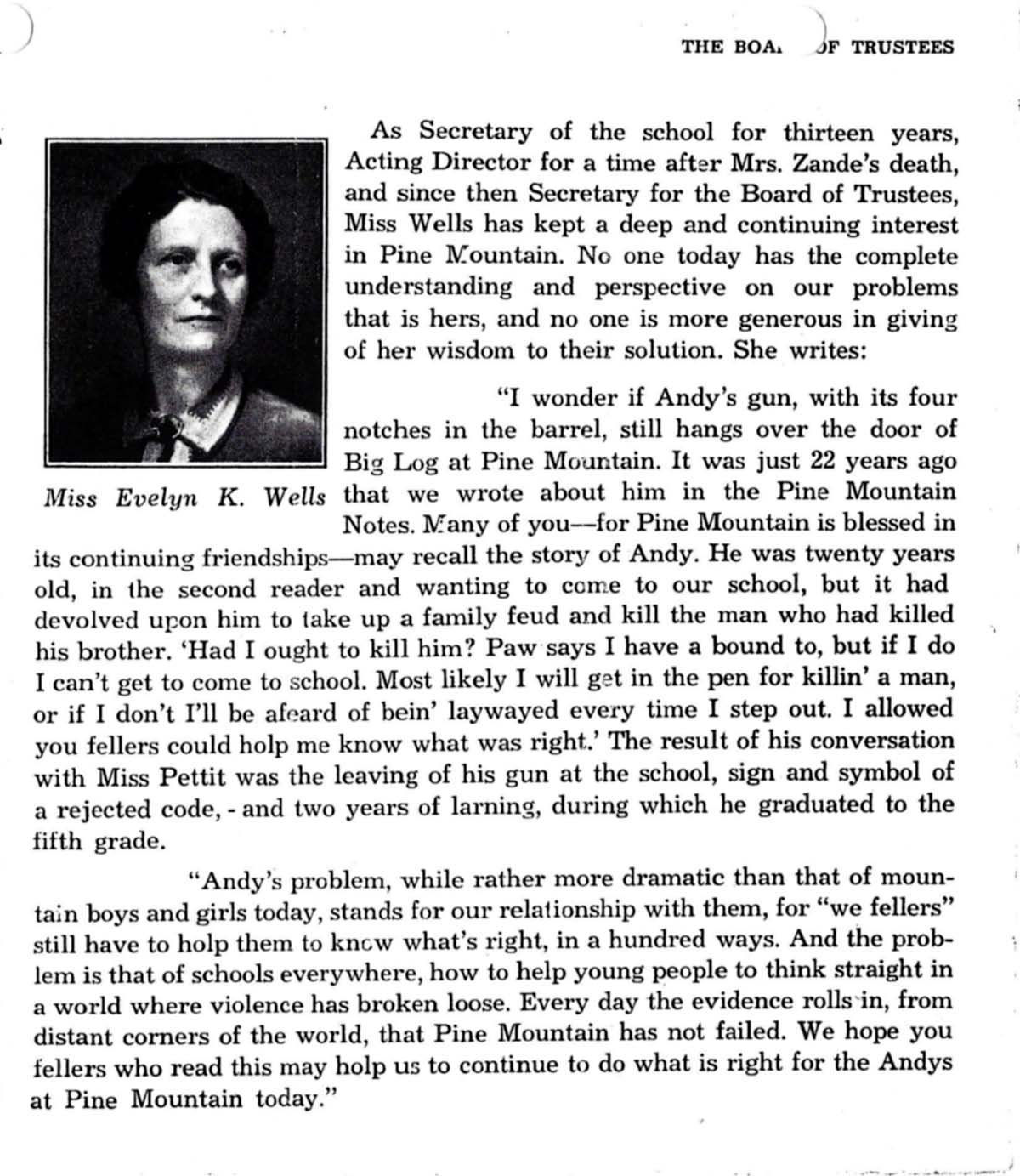 “Andy’s problem, while rather more dramatic than that of mountain boys and girls today, stands for our relationship with them, for ‘we fellers’ still have to holp them to know what’s right, in a hundred ways. And the problem is that of schools everywhere, how to help young people to think straight in a world where violence has broken loose. Every day the evidence rolls in, from distant corners of the world, that Pine Mountain has not failed. We hope you fellers who read this may holp us to continue to do what is right for the Andys at Pine Mountain today.”