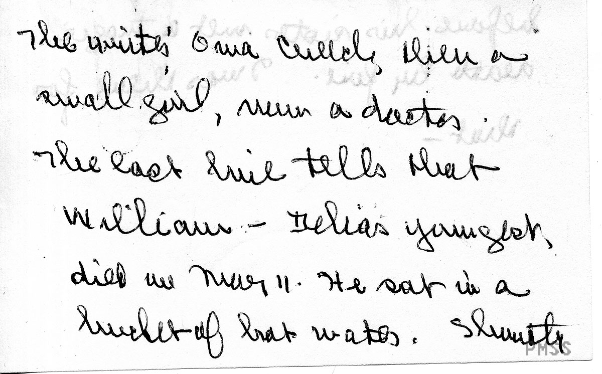 The writer’s Oma Creech, then a small girl, now a doctor. The last line tells about William – Delia’s youngest, died on May 11. He sat in a bucket of hot water. Shortly before his sister met a tragic death by fire. I was there for that.
