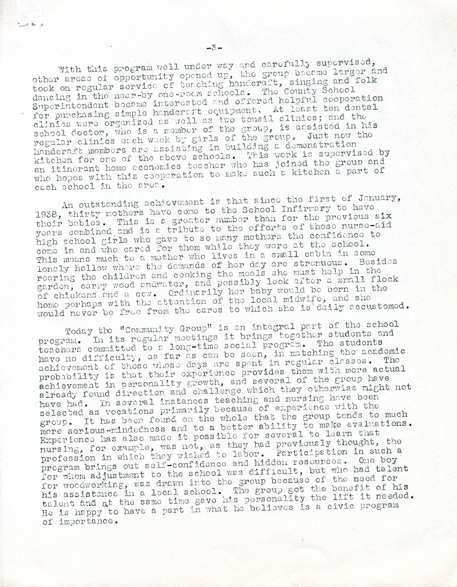 An outstanding achievement is that since the first of January, 1938, thirty mothers have come to the School Infirmary to have their babies. This is a greater number than for the previous six years combined and is a tribute to the efforts of those nurse-aid high school girls who gave to so many mothers the confidence to come in and who cared for them while they were at the school. This means much to a mother who lives in a small cabin in some lonely hollow where the demands of her day are so strenuous. Besides rearing the children and cooking the meals she must help in the garden, carry wood and water, and possibly look after a small flock of chickens and a cow. Ordinarily, her baby would be born in the home perhaps with the attention of the local midwife, and she would never be free from the cares to which she is daily accustomed.