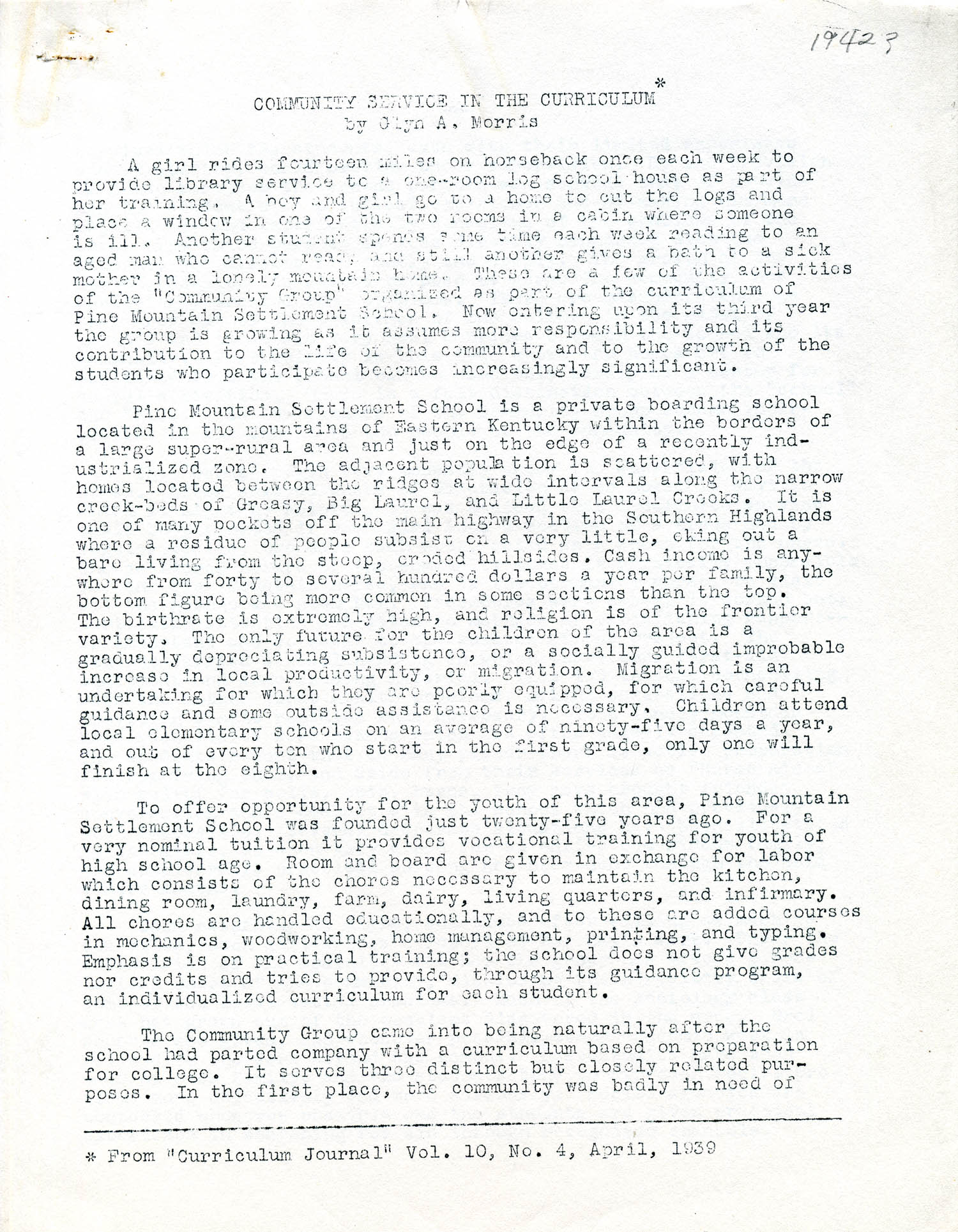 GLYN MORRIS 1939 WRITING Community Service in the Curriculum