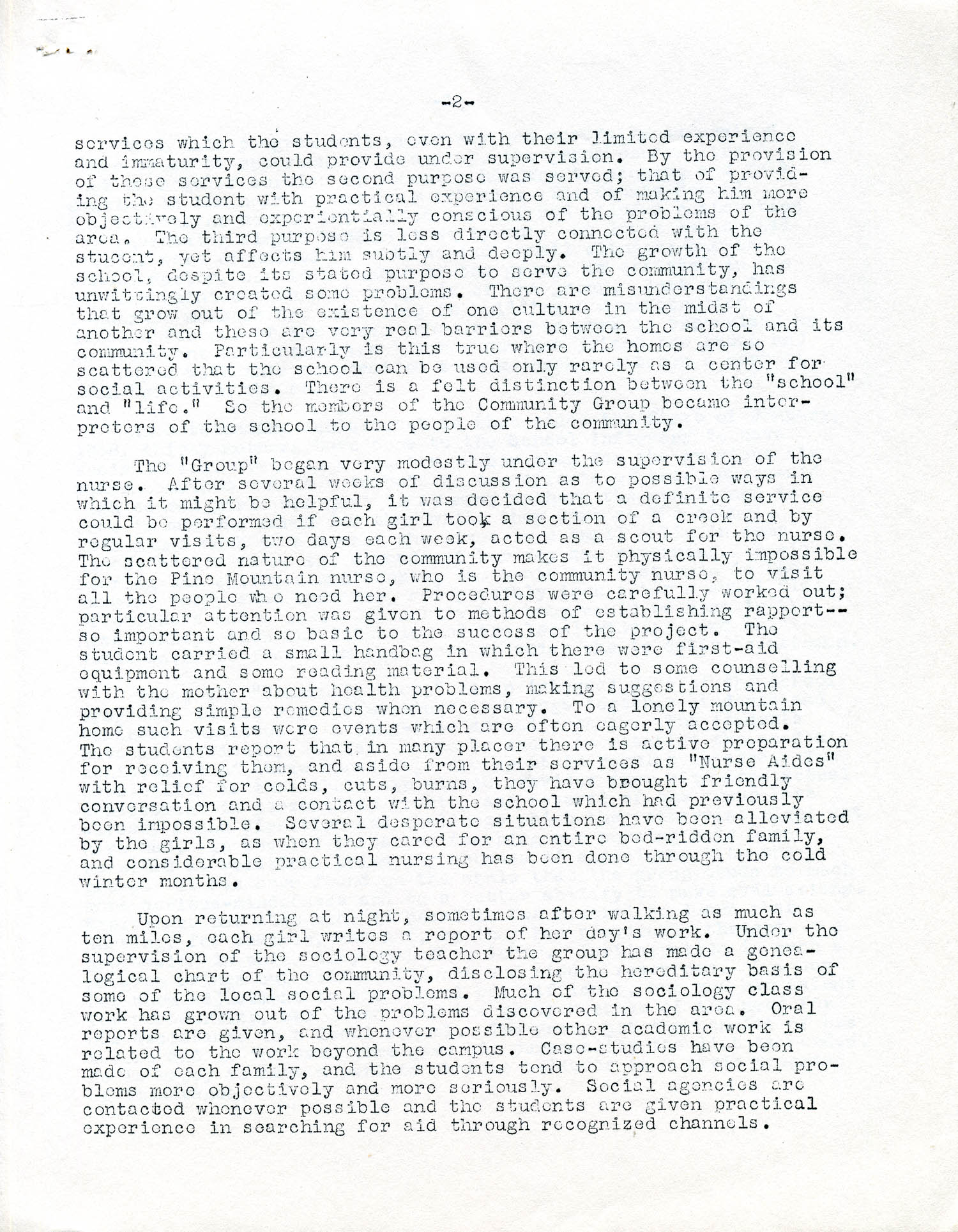 The “Group” began very modestly under the supervision of the nurse. After several weeks of discussion as to possible ways in which it might be helpful, it was decided that a definite service could be performed if each girl took a section of a creek and by regular visits, two days each week, acted as a scout for the nurse. The scattered nature of the community makes it physically impossible for the Pine Mountain nurse, who is the community nurse, to visit all the people who need her. Procedures were carefully worked out; particular attention was given to methods of establishing rapport — so important and so basic to the success of the project. The student carried a small handbag in which there were first-aid equipment and some reading material. This led to some counseling with the mother about health problems, making suggestions and providing simple remedies when necessary. To a lonely mountain home, such visits were events which are often eagerly accepted. The students report that in many places there is active preparation for receiving them, and aside from their services as “Nurses Aides” with relief for colds, cuts, burns, they have brought friendly conversation and a contact with the school which had previously been impossible. Several desperate situations have been alleviated by the girls, as when they cared for an entire bed-ridden family, and considerable practical nursing has been done through the cold winter months.