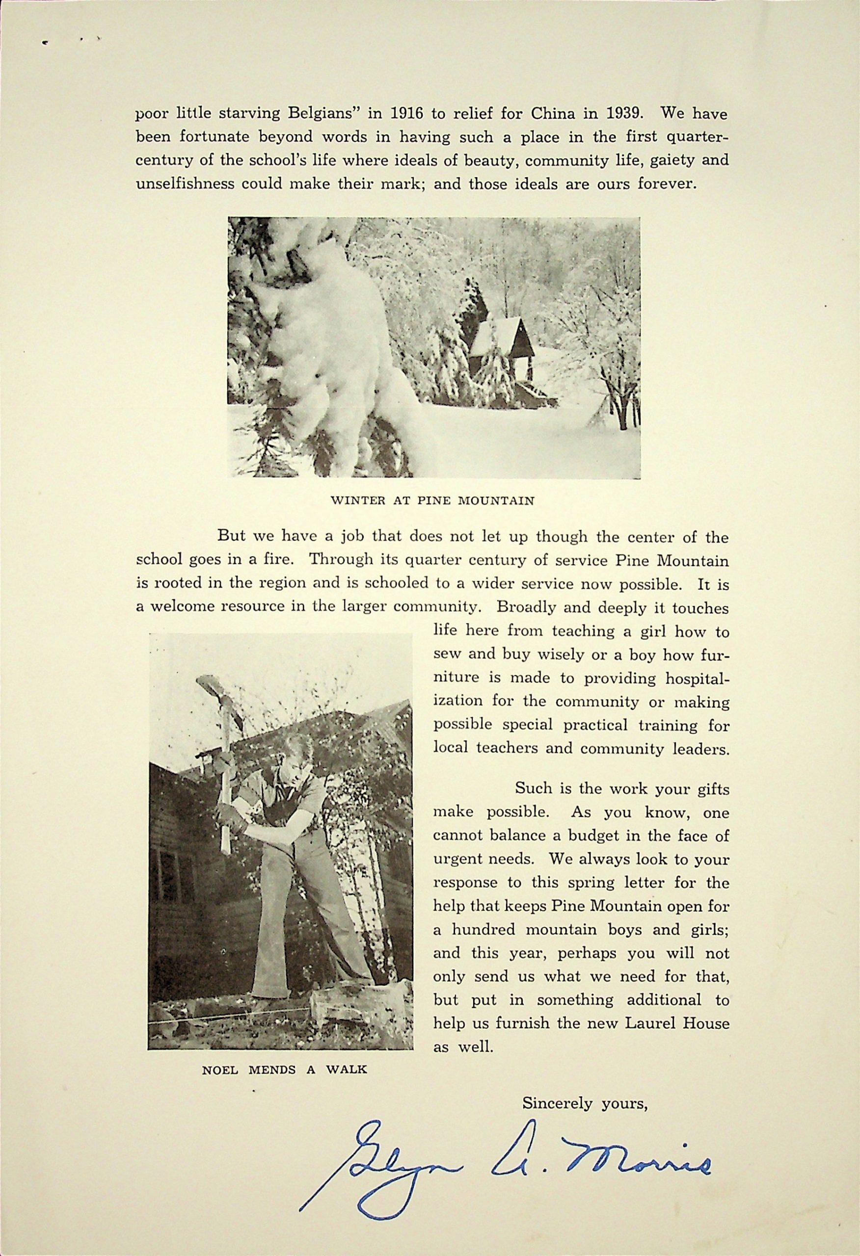 Such is the work your gifts make possible. As you know, one cannot balance a budget in the face of urgent needs. We always look to your response to this spring letter for the help that keeps Pine Mountain open for a hundred mountain boys and girls; and this year, perhaps you will not only send us what we need for that, but put in something additional to help us furnish the new Laurel House as well.