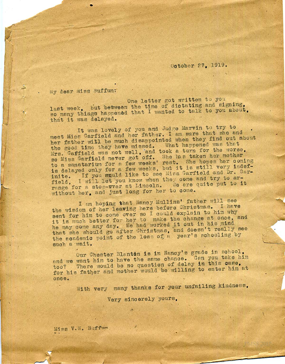 1919 November 1 To Marguerite Butler from Ethel Zande. A letter saying how sorry the school is for her “… prolonged inactivity, it is a perfect shame! But we are all thankful as we can be that you aren’t disabled for life.” Ethel Zande notes how complicated her life is with her ailing mother and her duties as a new mother. Asks Marguerite to go to the Inter-church World Movement conference in Lexington as “it is something we should be in on,” and tells her that her duties for Christmas arrangements have been handed over to someone else.
