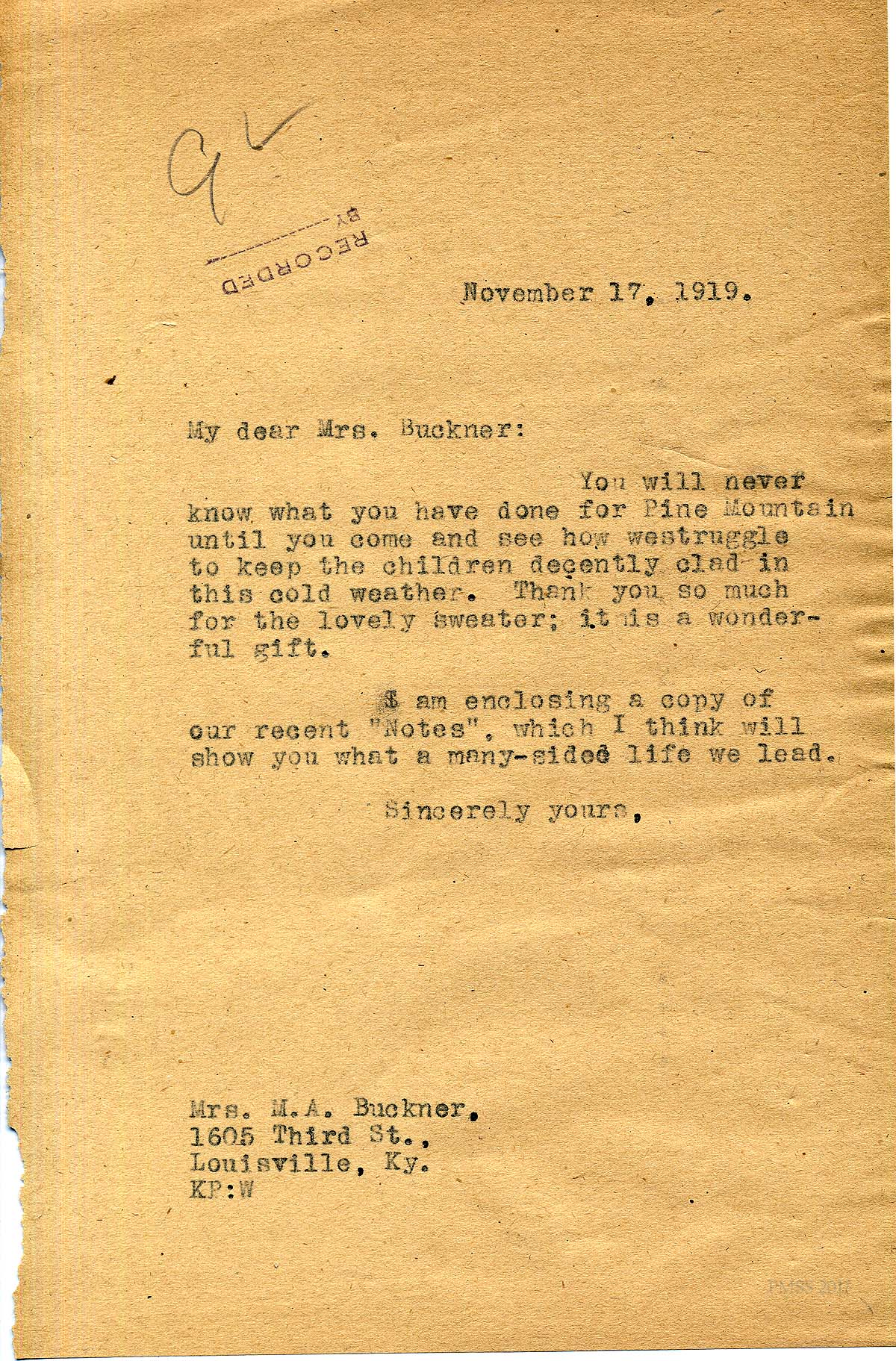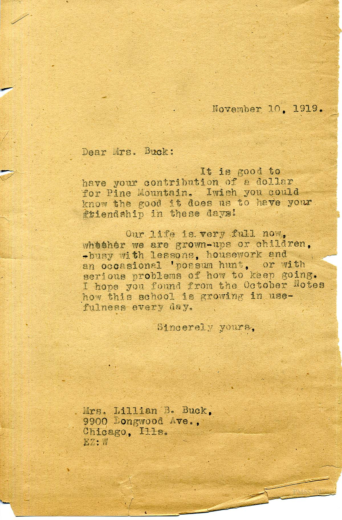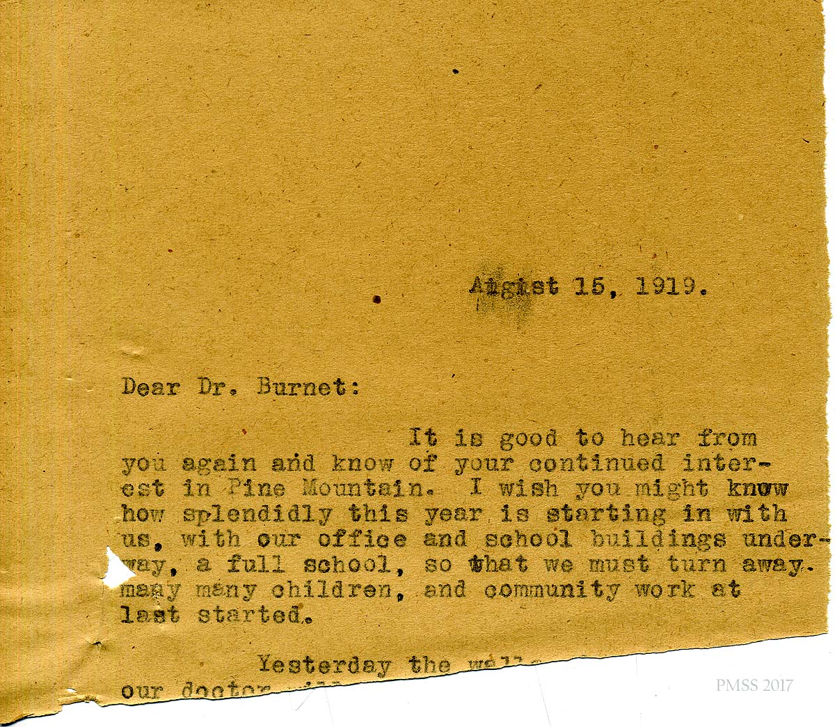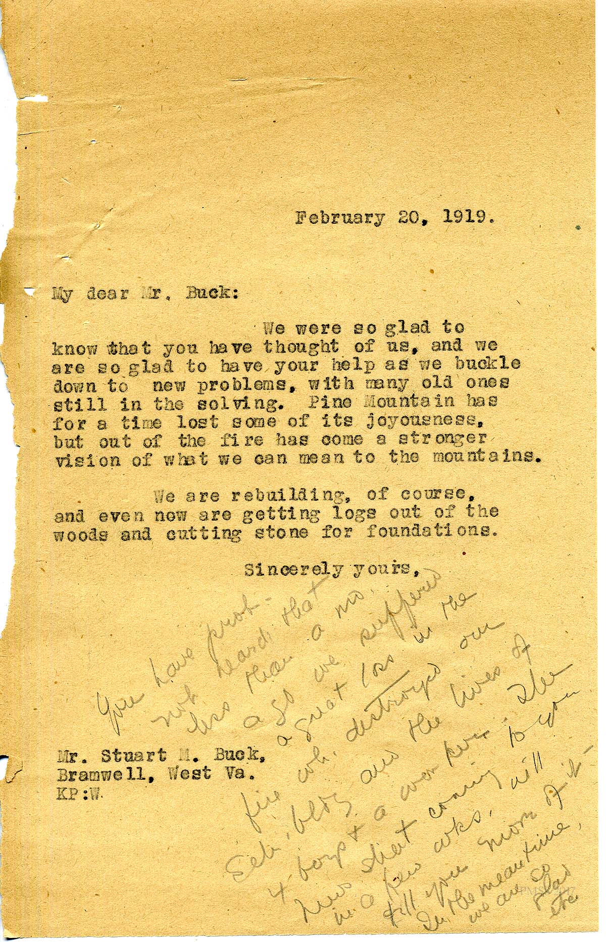 1919 February 20 To Mr. Stuart M. Buck, Bramwell, West Va. from Katherine Pettit. “We were so glad to know that you have thought of us and we are so glad to have your help as we buckle down to new problems, with many old ones still in the solving. Pine Mountain for a time lost some of its joyousness, but out of the fire has come a stronger vision of what we can mean to the mountains. .. We are rebuilding, of course, and even now are getting logs out of the woods and cutting stone for foundations.” [Handwritten note at bottom by Ethel Zande? Wells? You have prob. not heard that less than a mo[nth] ago we suffered a great loss in the fire wh. destroyed our Sch. Bldg. and the lives of 4 boys & a worker. The news sheet coming to you in a few wks. will tell you more of it. In the meantime we are so glad …etc.]