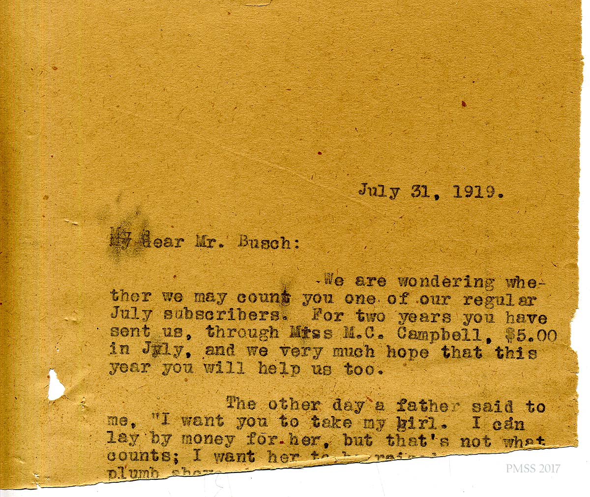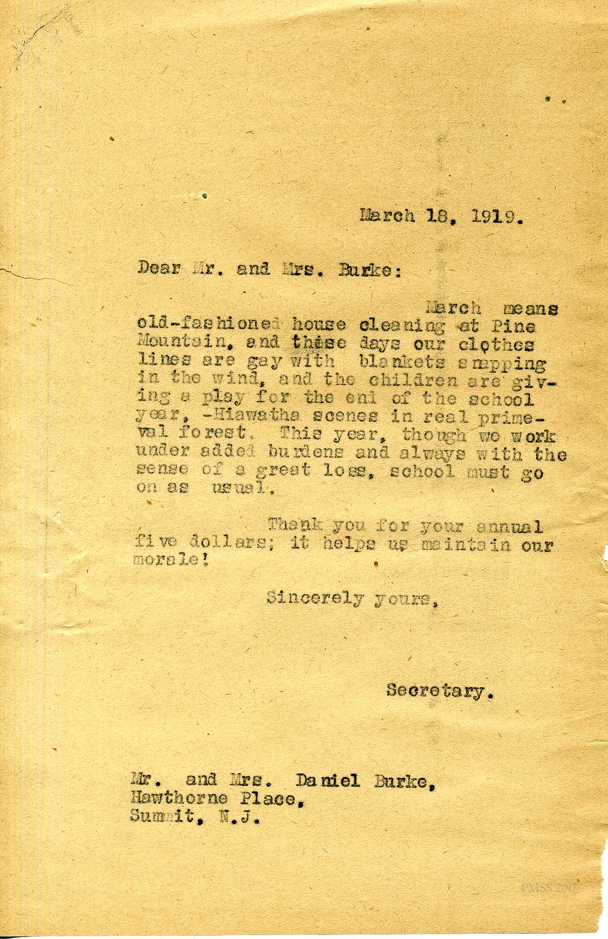 1919 March 18 To Mr. and Mrs. Daniel Burke, Hawthorne Place, Summit, N.J. from PMSS. Thanks them for their donation and adds, “… children are giving a play for the end of the school year, — Hiawatha scenes in real primeval forest. This year, though we work under added burdens and always with the sense of a great loss — school must go on as usual.”